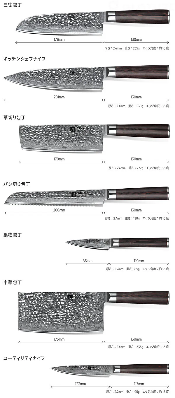 ・果物包丁、ユーティリティナイフ、三徳包丁、パン切り包丁、キッチンシェフナイフ、菜切り包丁