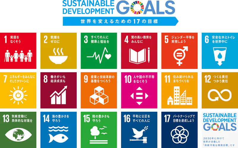 2015年9月の国連サミットで採択された「持続可能な開発のための2030アジェンダ」にて記載された2016年から2030年までの国際目標を言い、17の目標と169のターゲットから構成る。近年、社会問題に取り組む企業がクローズアップされる機会も多く、CSRの一環として取り組む企業も多い。