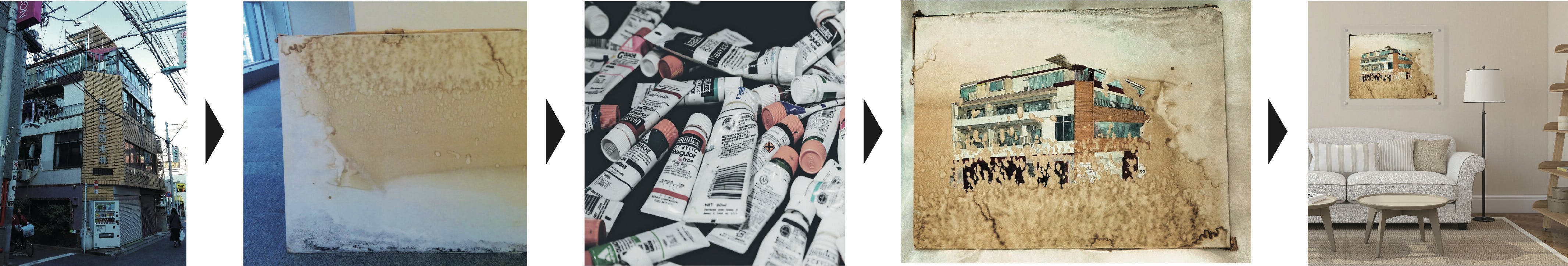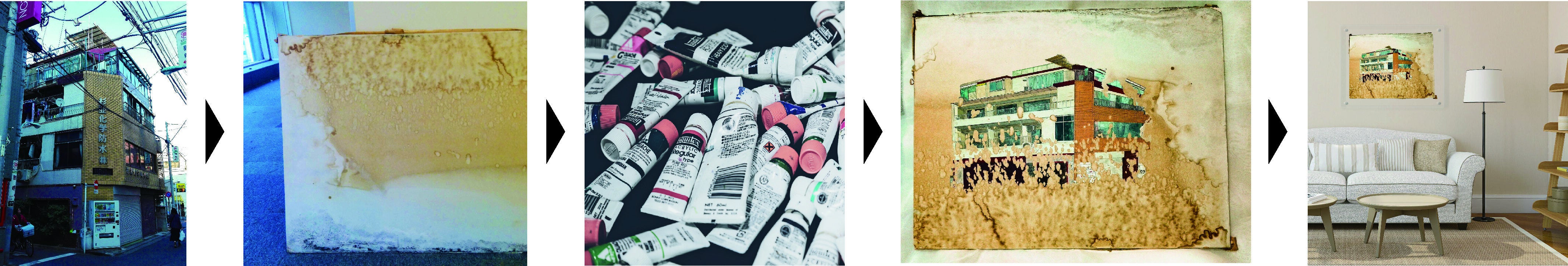 見つけた欠片の素材によって、手法を多少変更する可能性がありますが、基本的にはアクリル絵具による描画となります。下絵を元に、汚れの風景を残しつつ汚れと建物が一つになる風景を作ります。