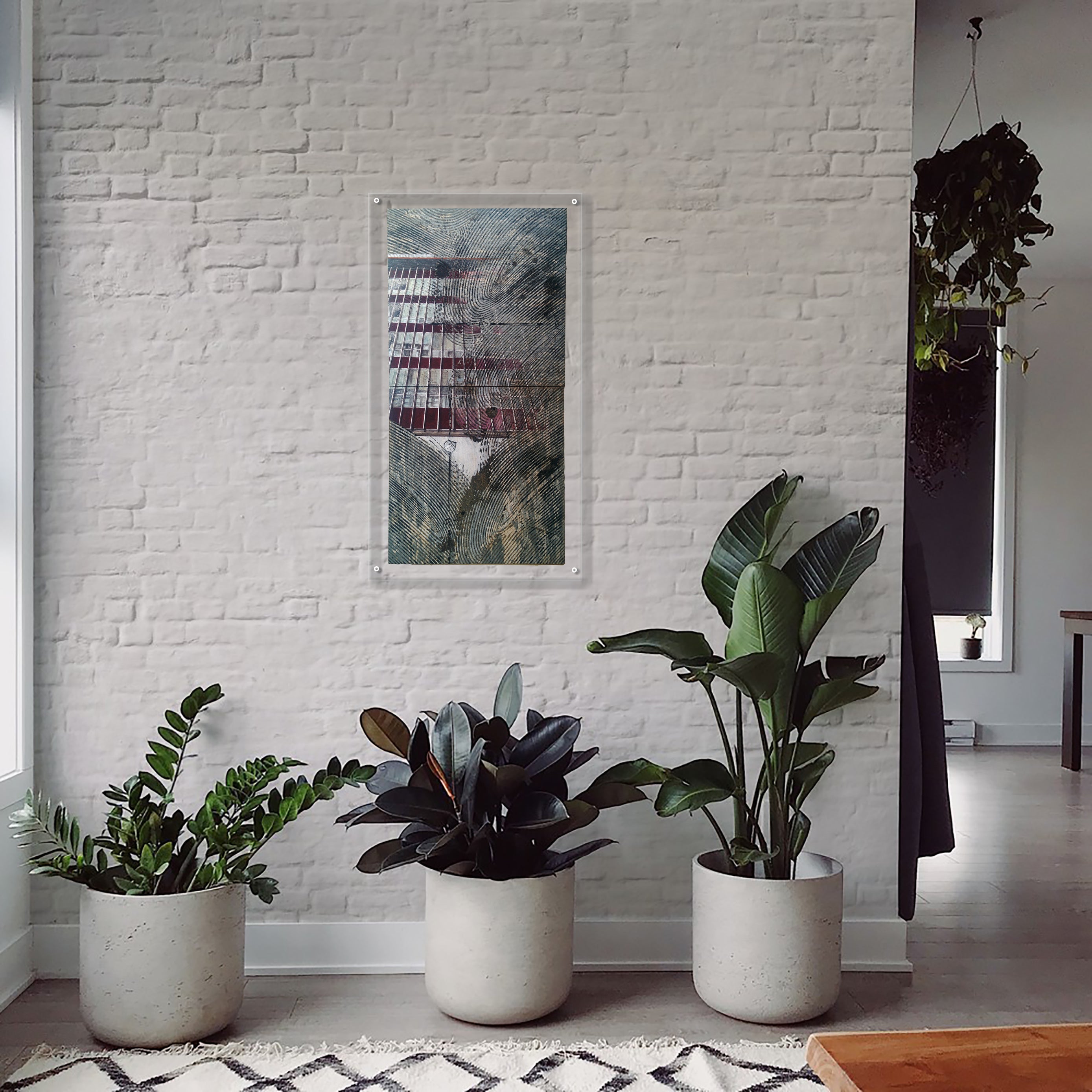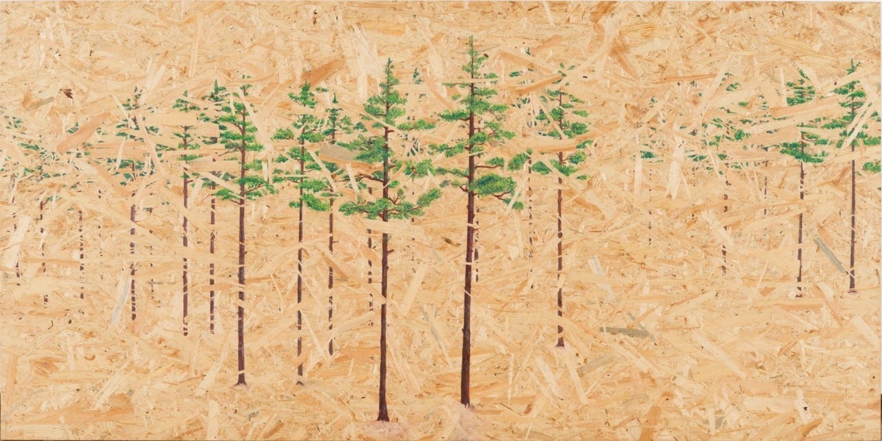 建材であるOSB合板の特徴的な板目の中に、木々の絵を織り込んだ作品です。