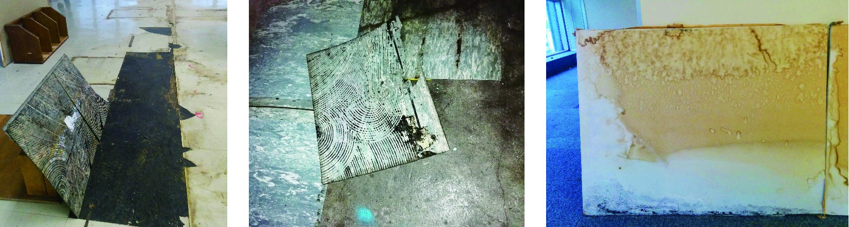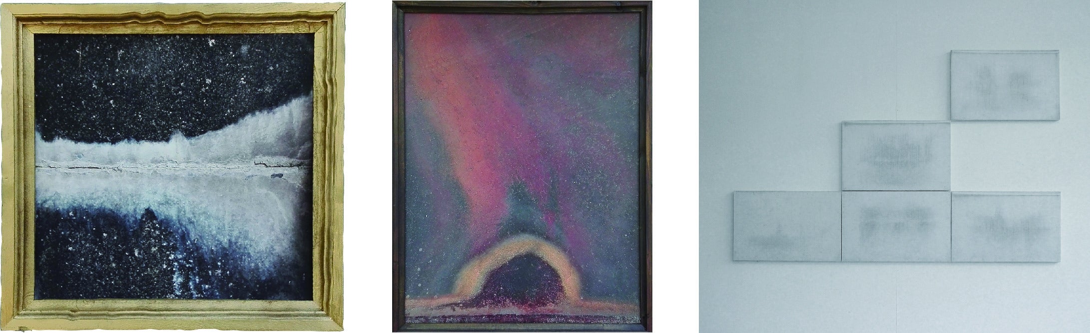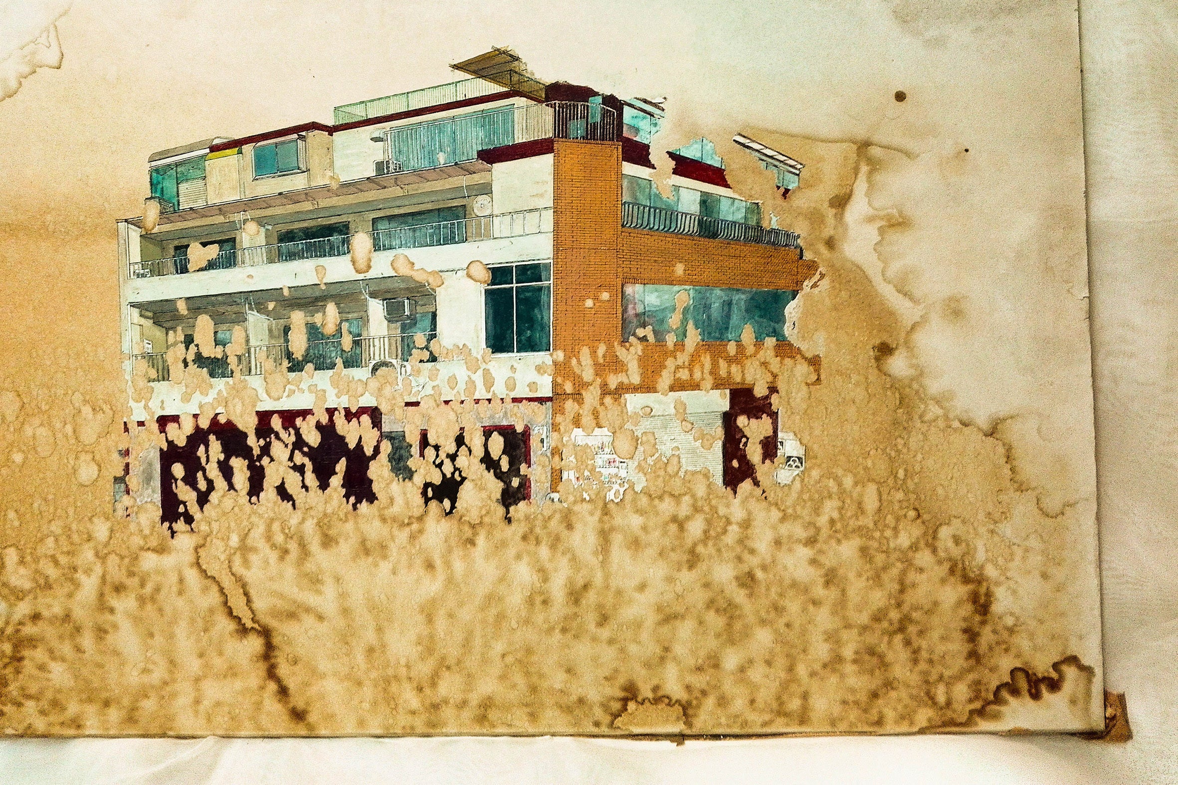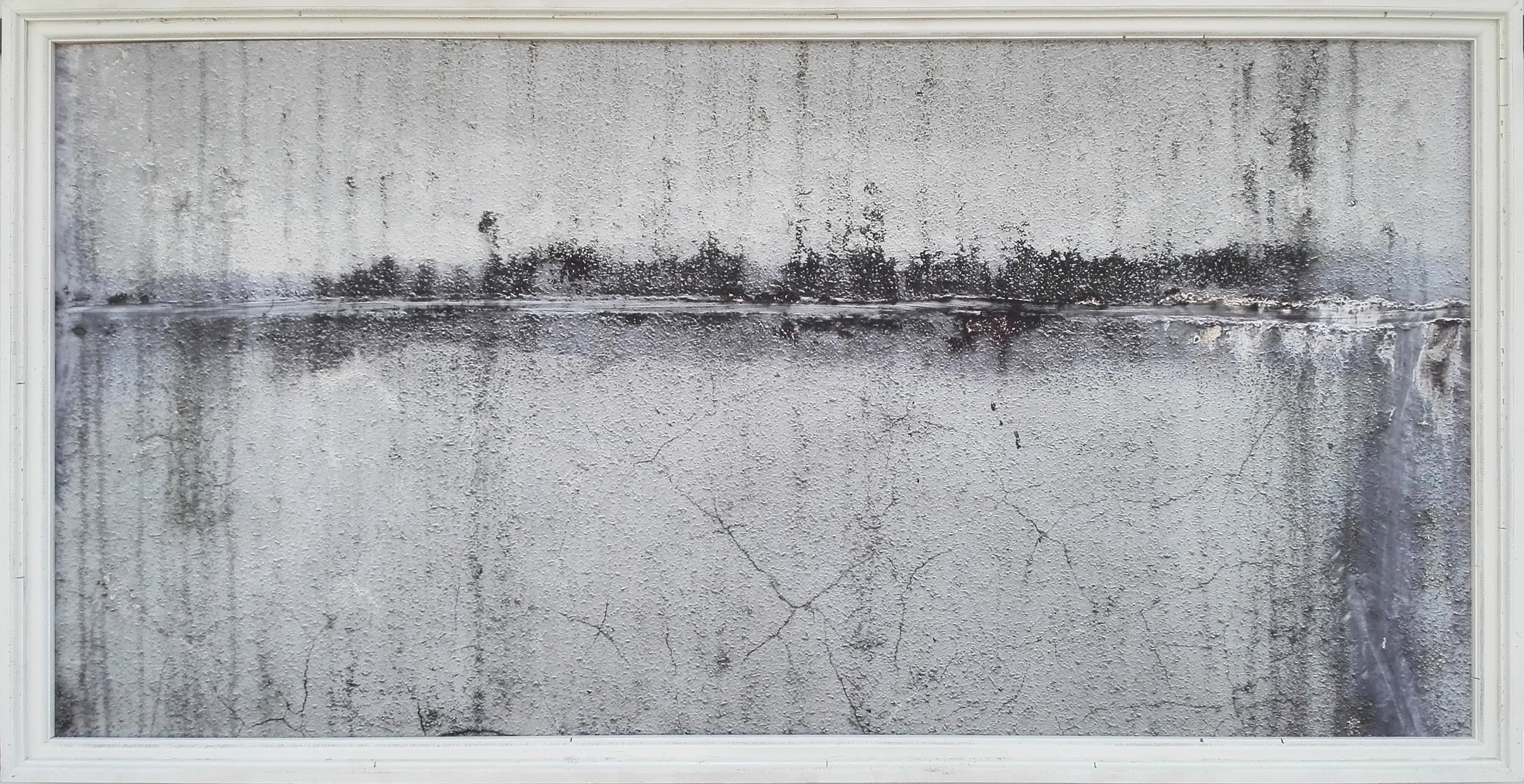 汚れの絵画シリーズより「汽水林」作品のベースとなる建物の欠片を探すことから作品制作を始めます。壁や床の一部などの経年劣化したシミや汚れは、それだけで多くの物語や情景を運んでいます。年月によって塗り重ねられたシミや汚れが、絵の具で描いたように感傷的な風景を引き連れていると考える、私の写真作品シリーズ「汚れの絵画」が今作品の一つの出発点となっています。