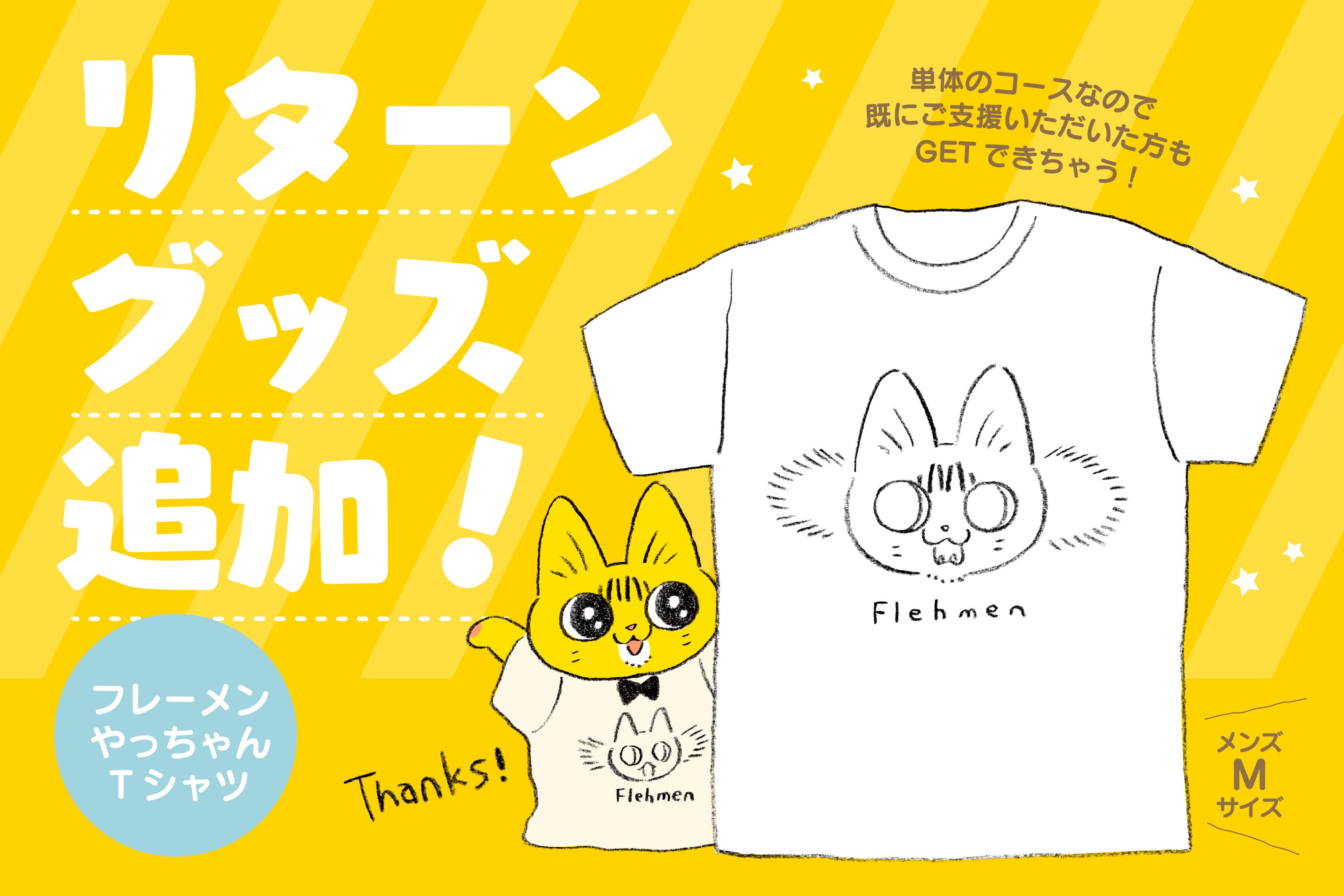 「茶トラのやっちゃんぬいぐるみプロジェクト」を応援していただきありがとうございます!・新リターン発表すでにプロジェクトページの方は更新させていただきましたが、追加リターンに「フレーメンやっちゃんTシャツ」を追加いたしました。類さん描き下ろしのクラウドファンディング限定デザインTシャツです。※デザインはプリント印刷です。※サイズはメンズM、ワンサイズでのご用意です。支援金額は5,260円です。Tシャツ単品のリターンのため、既にご支援いただいた方も応援いただけるプランです。「茶トラのやっちゃんぬいぐるみプロジェクト」は残り22日。スタートから折り返し地点となりました。引き続きの応援どうぞよろしくお願いいたします!
