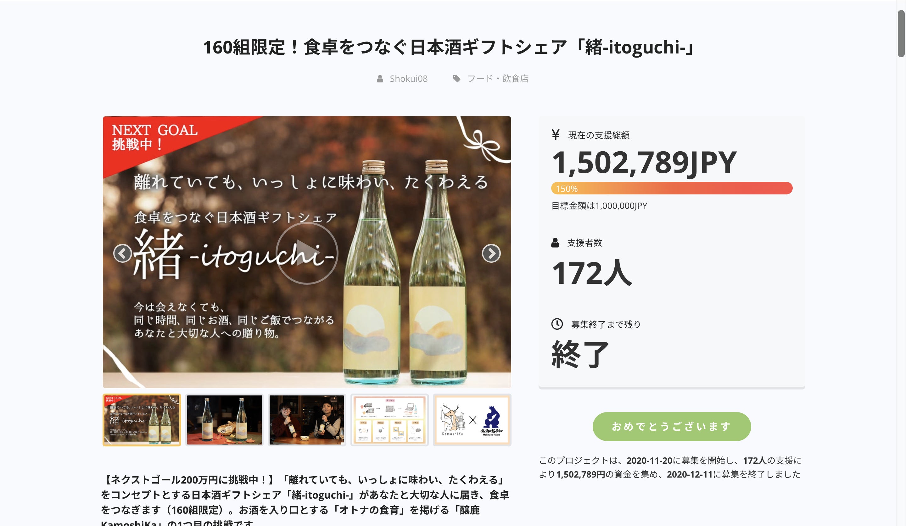 2020/12/12 12:00プロジェクトをご支援、応援いただいたみなさま醸鹿・代表の高桑雅弘です。昨日、本プロジェクトは172名の方々からの150万円を越えるご支援を受けて終了いたしました。11月20日(金)から始まった、たった3週間のプロジェクト。夢を見ていたのじゃないか。そう思うくらい長く、そして一瞬で過ぎ去った3週間でした。現実離れした感覚が今もまだ残っており、少し動揺しています。改めてになりますが、ご支援と温かい応援をありがとうございました。まずは"緒”の配送準備にメンバー全員で取り組みます。異なる場所にいても、大切な人と温かい食卓を囲む当たり前を。引き続き活動報告を通して見守っていただければ幸いです。 もっと見る