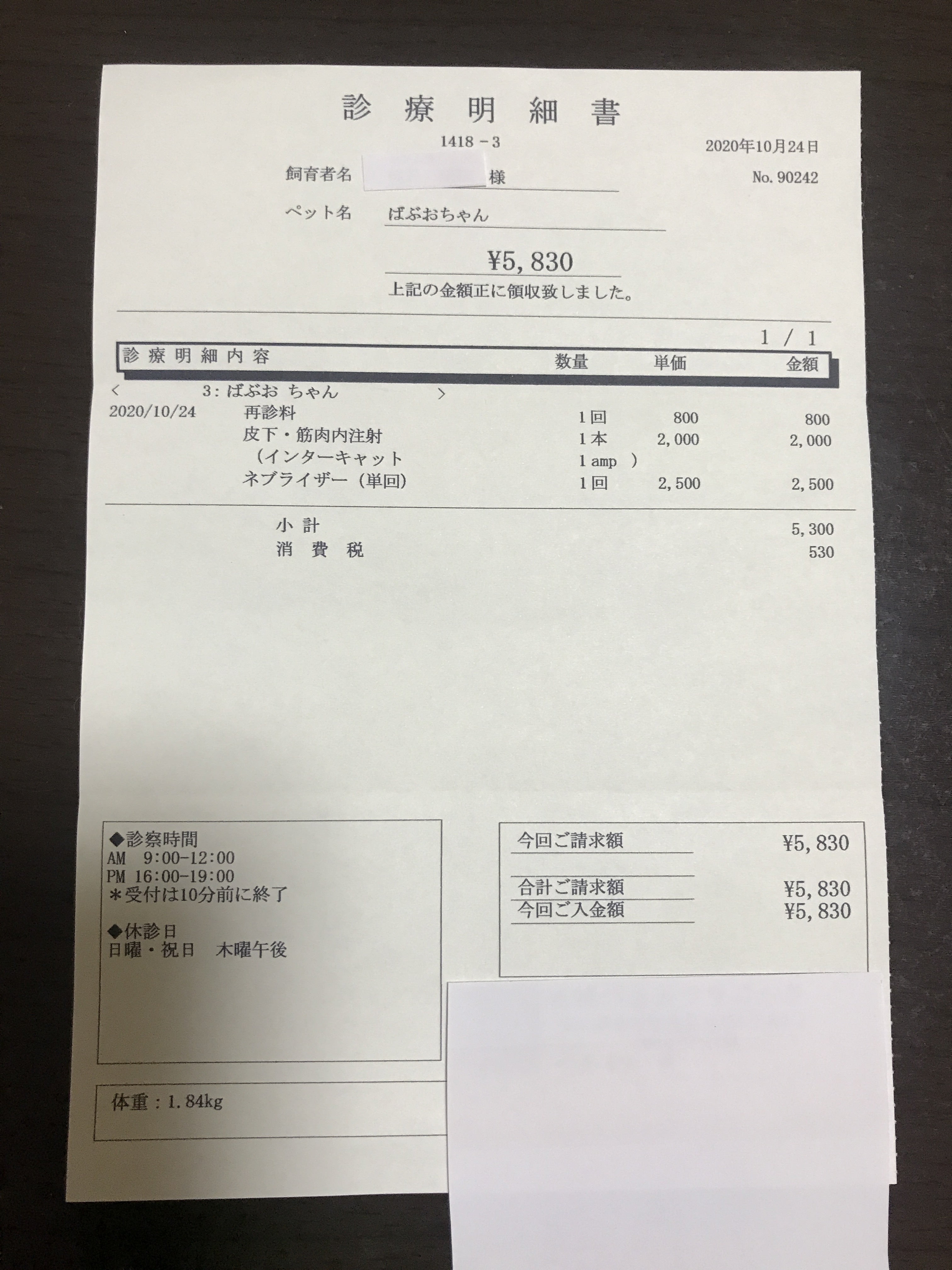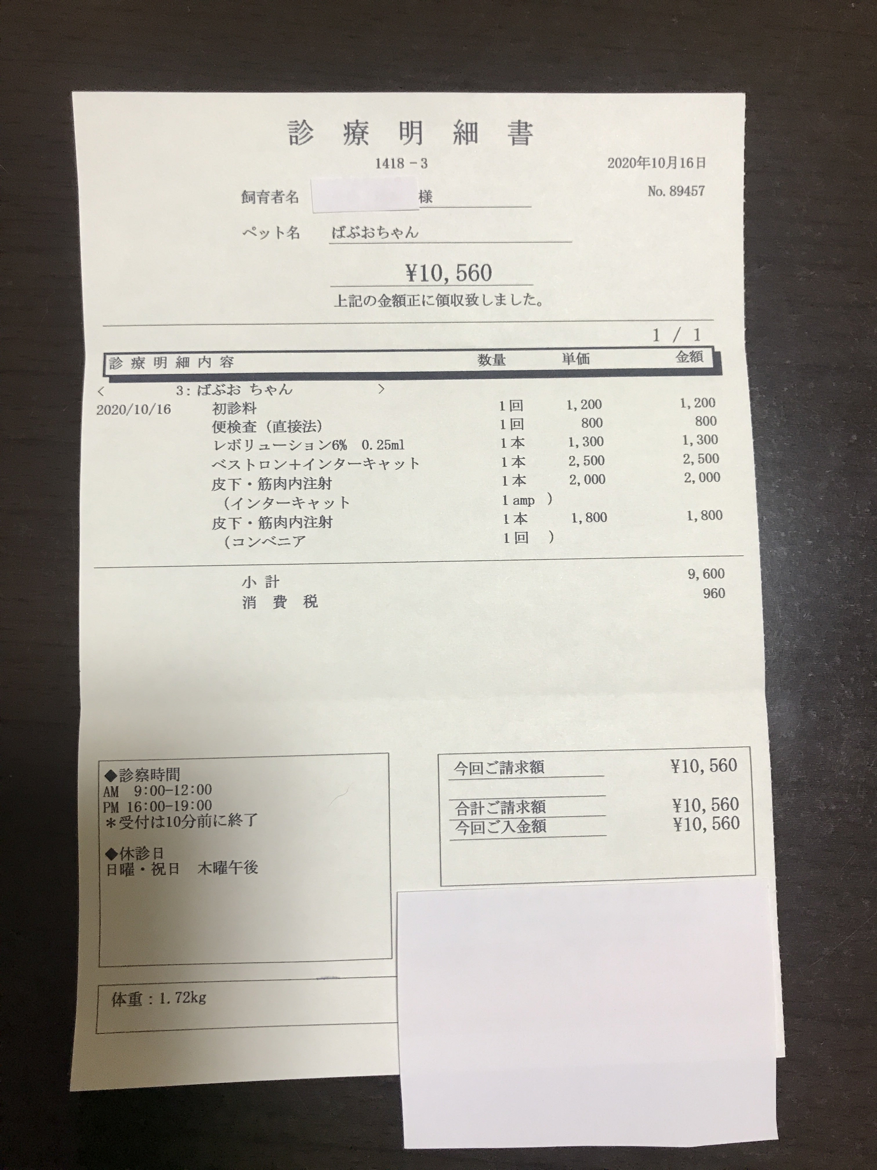 元々食が細かったのですが、少しずつ食べるようになり体重も増えていたので風邪が長引いているものだと思っていました。この日は注射を打ってもらい、1週間後に経過を見せに来て下さいとの事でした。
