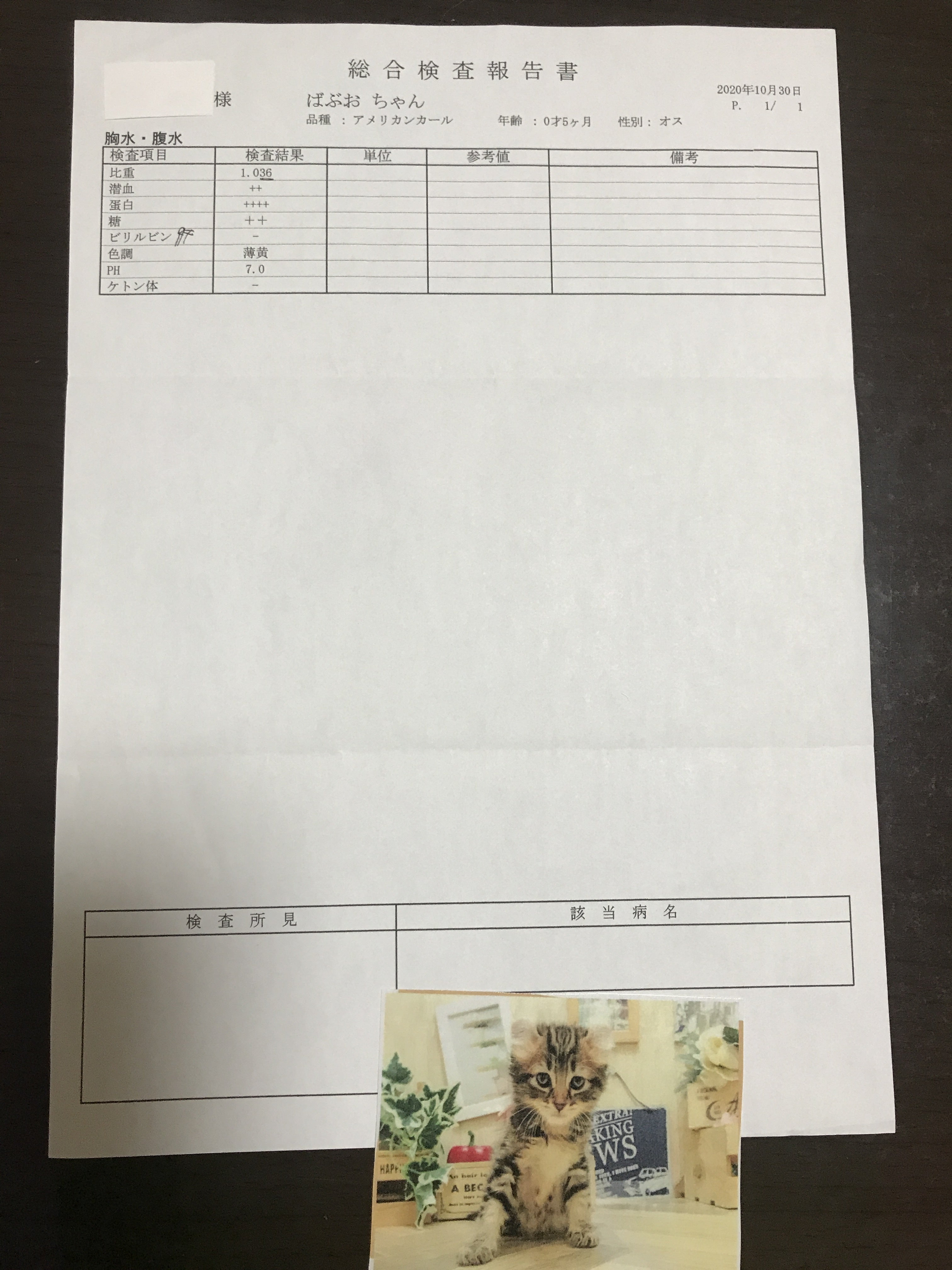すると最悪な事にやはり腹水がたまっていました。腹水がたまる原因は色々あるそうですが、子猫で腹水...FIP以外考えられず、この時点で頭は真っ白でした。