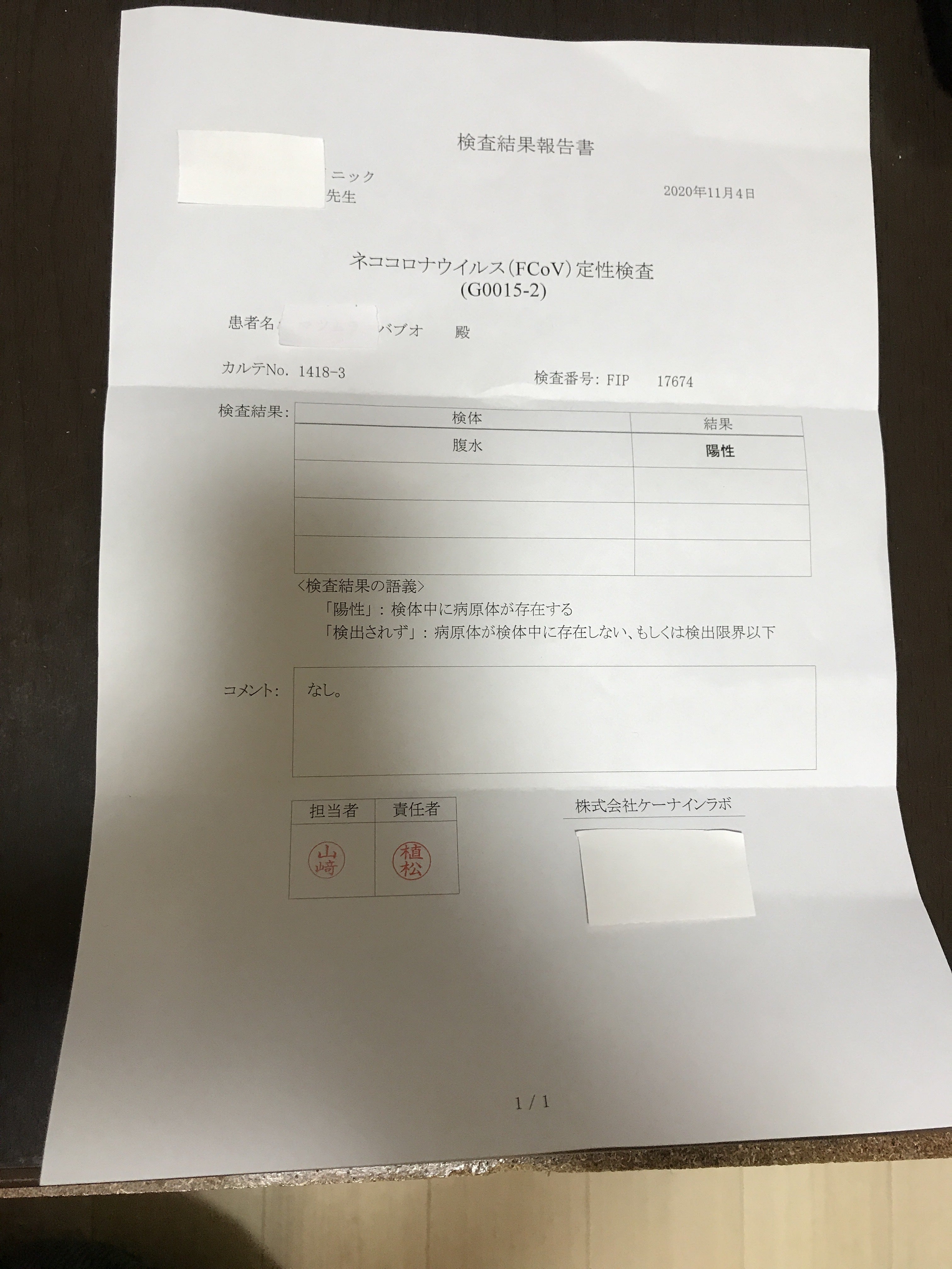 その後11月5日かかりつけから電話があり、腹水からコロナウイルスが検出されました。これでFIPは確定です。