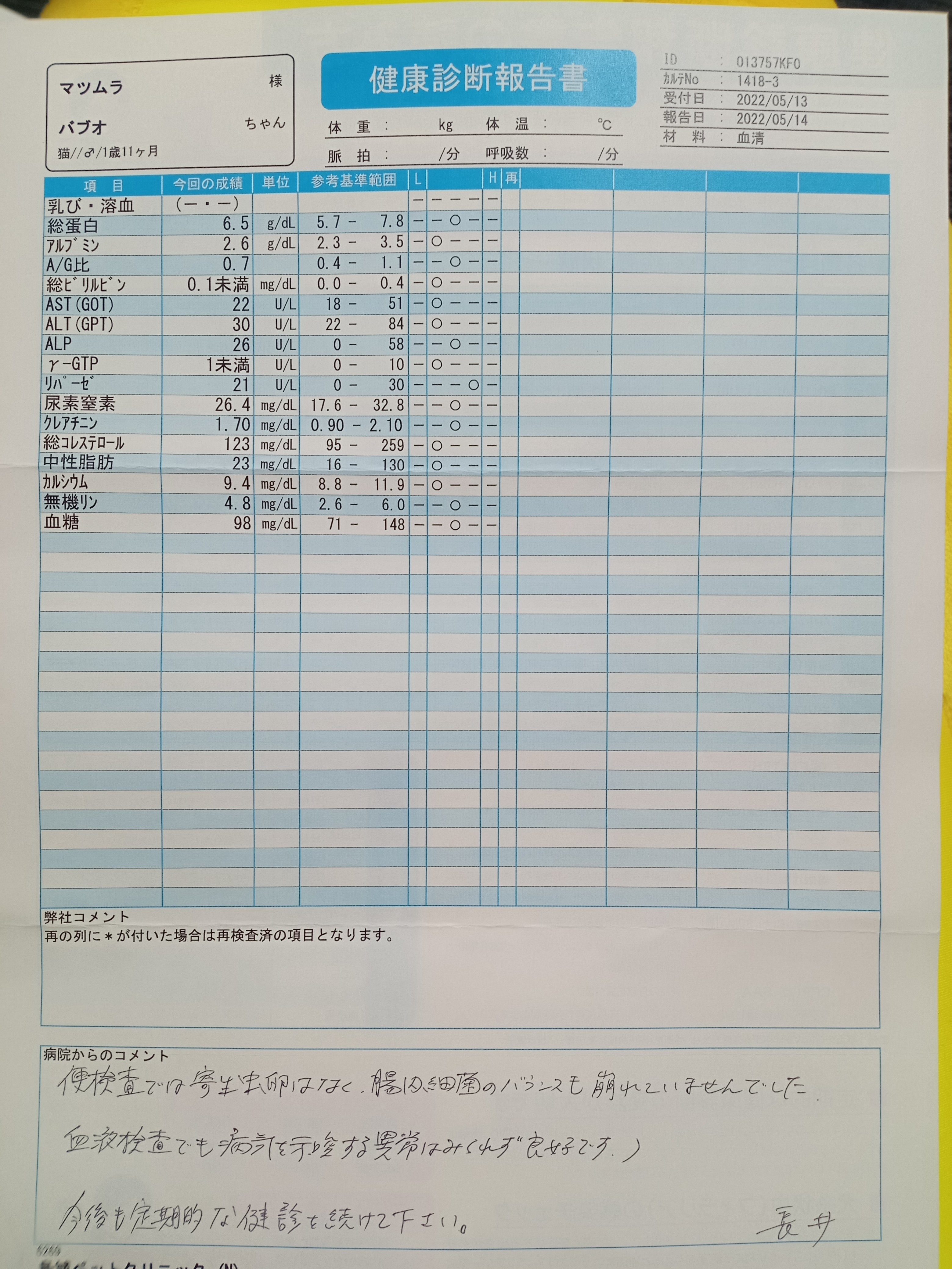 2022/06/16 20:23こんばんは☆遅くなりましたが、ばぶちゃんの検査結果をご報告しますm(_ _)m血液検査も問題なし!よく下痢になるばぶちゃんですが、腸内細菌バランスも大丈夫でした!これからも元気に過ごしてほしいと思います(^^) もっと見る