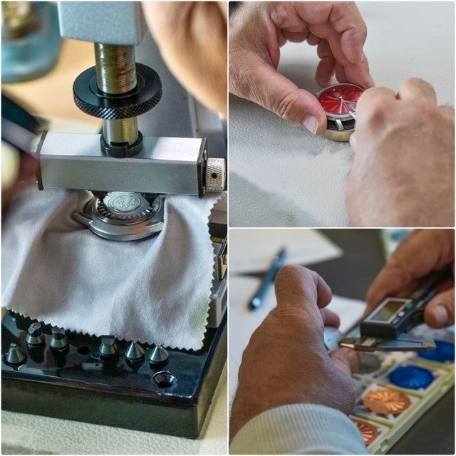 そして、それらの素材をスイスの工房で手作業で組み立て製品が完成します。