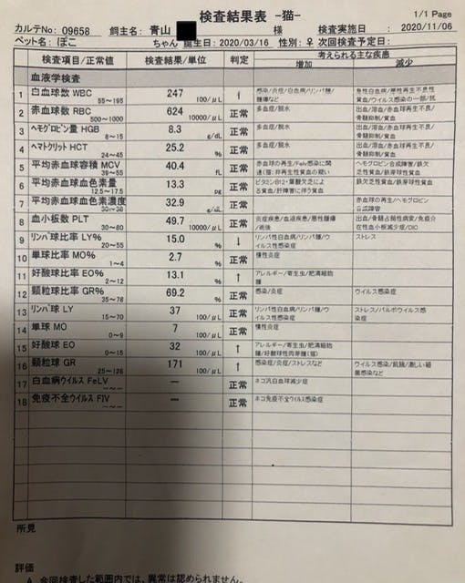 翌日、協力動物病院でぽこちゃんの診察をしていただくと、A/G比、猫コロナウイルス抗体価、症状を見る限りFIPと診断されました。簡単な計算法でa/g比を出していただくとa/g比0.28と低すぎる結果でした。