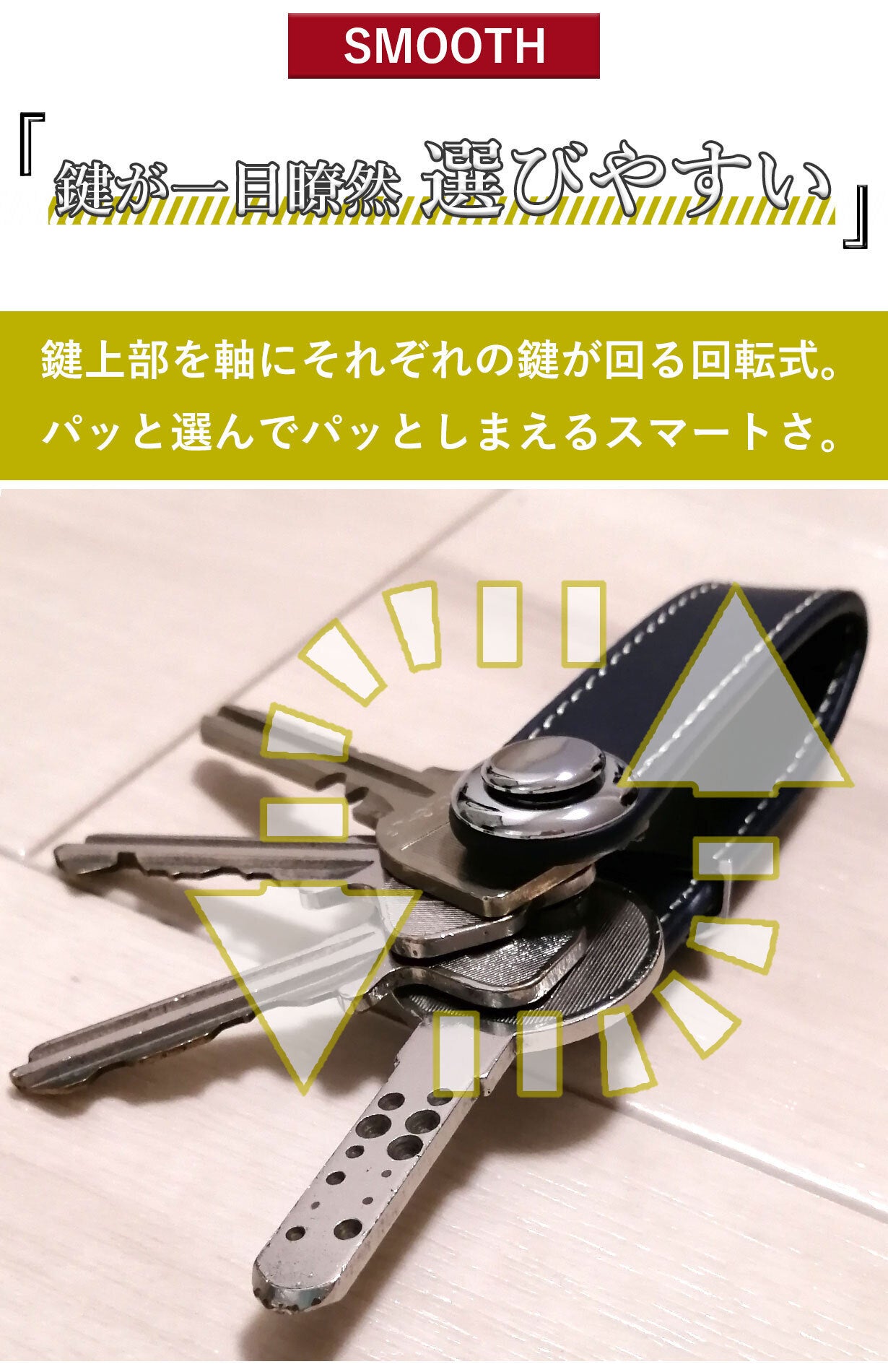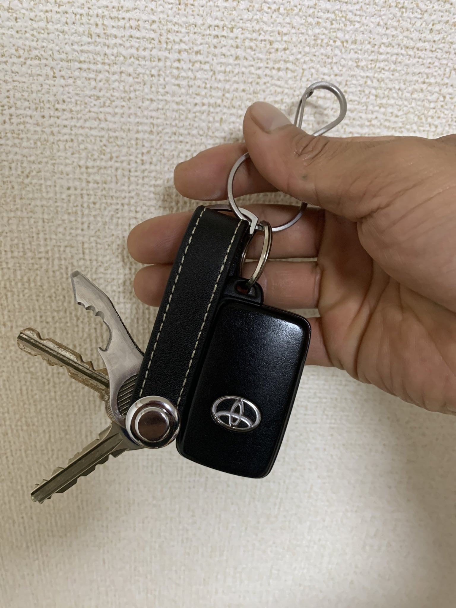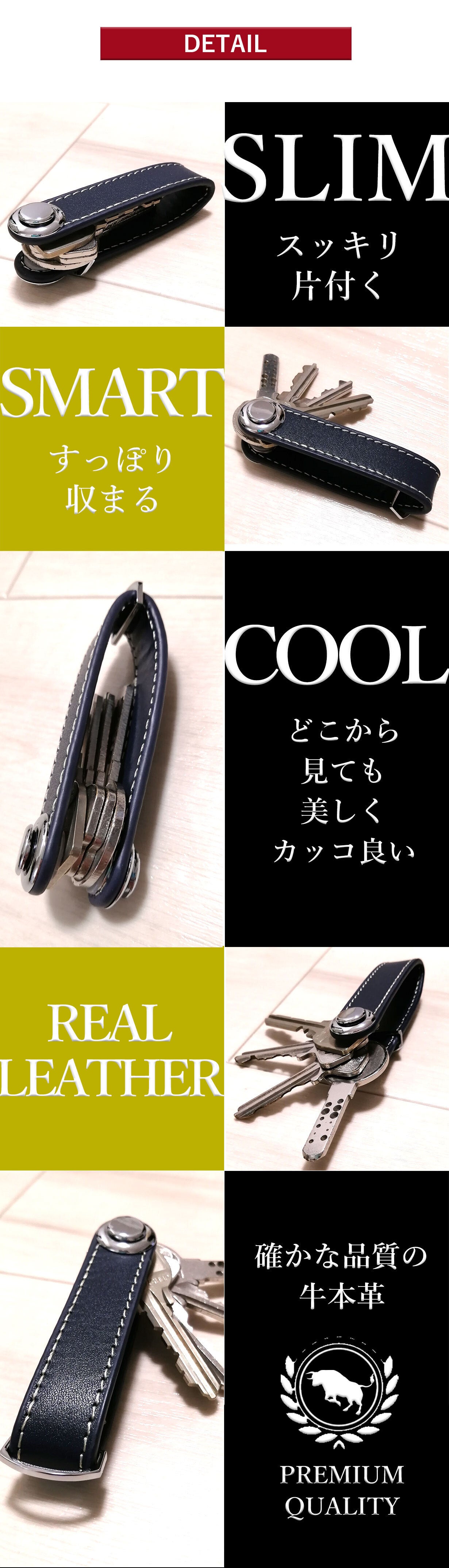 2020/12/04 19:00****以下、Hさんからいただいたお声****『キーケースよりコンパクトで、キーホルダーみたいにガチャガチャしない物です。私は厚みのある鍵を2本と普通の鍵1本を収納しています。挟み込む仕組みでしっかりホールドされており、鍵が勝手に出てくる事はありません。使いたい時に必要な鍵だけを選んで簡単にズラし出せます。ケースがそのまま取手のようになり、鍵が回しやすいです。スマートキーは収納できませんが、収納部にキーリングをとりつけられますので、一緒に管理する事ができます。カラビナと組み合わせて、腰からぶら下げる事もできます。 ステッチレザーとメッキの組み合わせも、程々に高級感があり気に入っています。 私はよくポケットに鍵をいれますが、嵩張ったり、音がしたり、先端が生地を痛めたりする悩みから解放されました。暫くの間お世話になろうと思います。』****以上****1か月程度、サンプリングを行っていただき、レビューをいただきました。貴重なご感想、ありがとうございました。 もっと見る