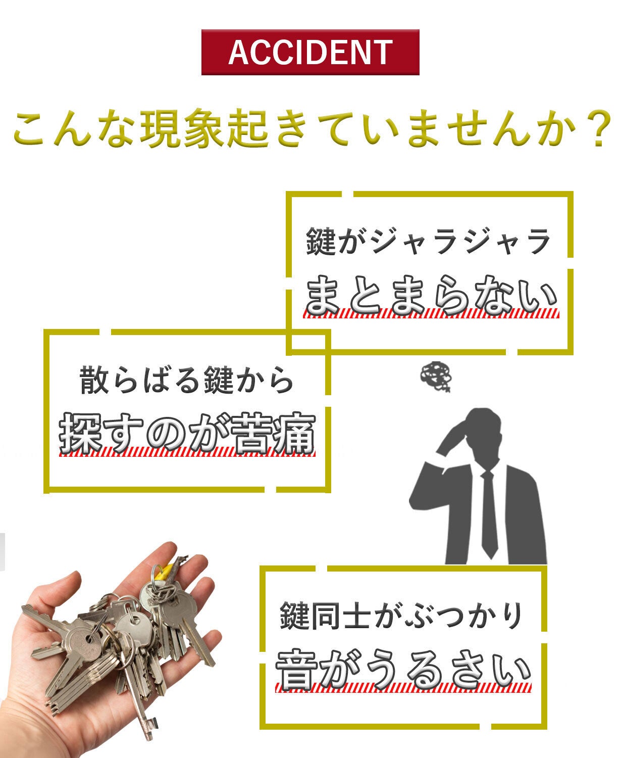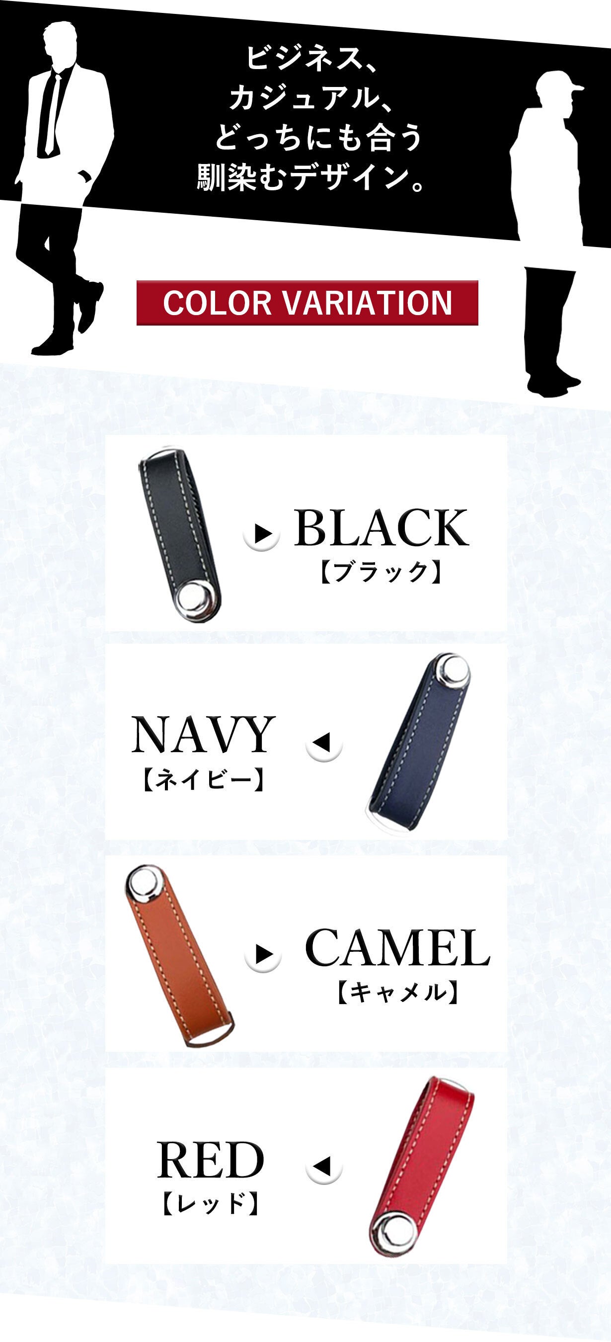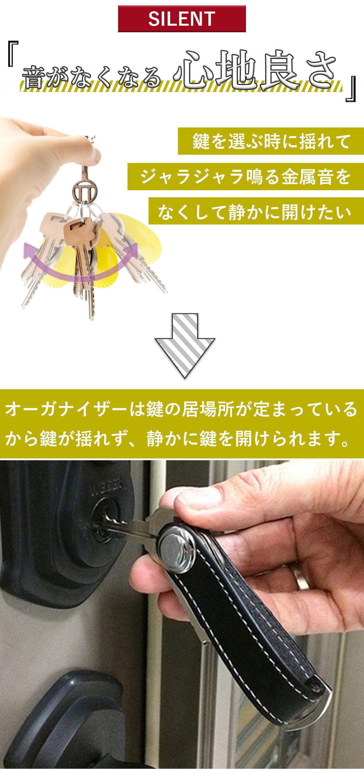 2020/12/04 19:00****以下、Hさんからいただいたお声****『キーケースよりコンパクトで、キーホルダーみたいにガチャガチャしない物です。私は厚みのある鍵を2本と普通の鍵1本を収納しています。挟み込む仕組みでしっかりホールドされており、鍵が勝手に出てくる事はありません。使いたい時に必要な鍵だけを選んで簡単にズラし出せます。ケースがそのまま取手のようになり、鍵が回しやすいです。スマートキーは収納できませんが、収納部にキーリングをとりつけられますので、一緒に管理する事ができます。カラビナと組み合わせて、腰からぶら下げる事もできます。 ステッチレザーとメッキの組み合わせも、程々に高級感があり気に入っています。 私はよくポケットに鍵をいれますが、嵩張ったり、音がしたり、先端が生地を痛めたりする悩みから解放されました。暫くの間お世話になろうと思います。』****以上****1か月程度、サンプリングを行っていただき、レビューをいただきました。貴重なご感想、ありがとうございました。 もっと見る