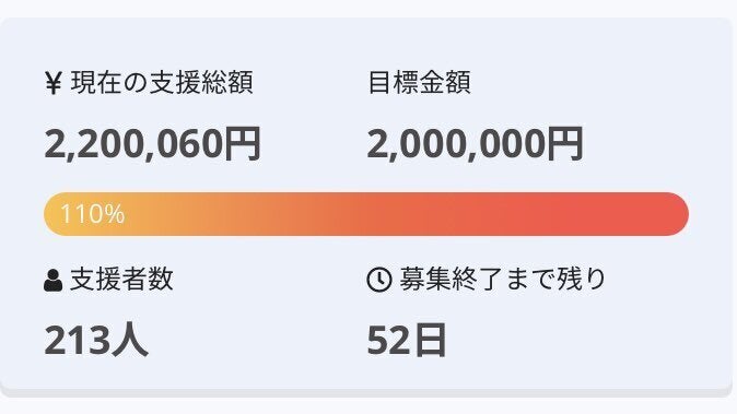 皆様のおかげで支援金額が目標の110%である220万円を突破しました。