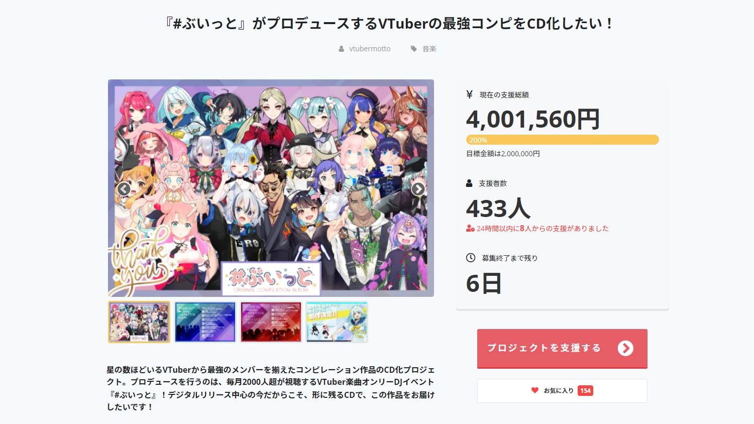 皆様のおかげで支援金が目標金額の2倍である400万円を達成しました!一般的にクラウドファンディングは最初の5日間で目標の20%を達成できれば上出来とされているのですが当クラウドファンディングは開始4日で100%、6日で150%と異常な盛り上がりを見せていました。それだけ皆様がVTuberに興味を持っているということに非常に感動しましたし、#ぶいっと への期待と信頼も実感させていただきました。また、当プロジェクトの締め切りは1/31(日)23:59となっておりますが、多くの方から要望があったため近日中にすでに支援してくださった方向けのプランを追加しますのでお財布に余裕のある方はご検討いただけますと幸いです。さらに、最終日の1/31(日)20:00よりコンピメンバーによるコラボ配信 #ぶいっと学力テスト を実施しますので是非リアタイして一緒に盛り上がれればと思います。こちらから視聴できます!事前にチャンネル登録、高評価、リマインダー設定していただけますと励みになります…!!