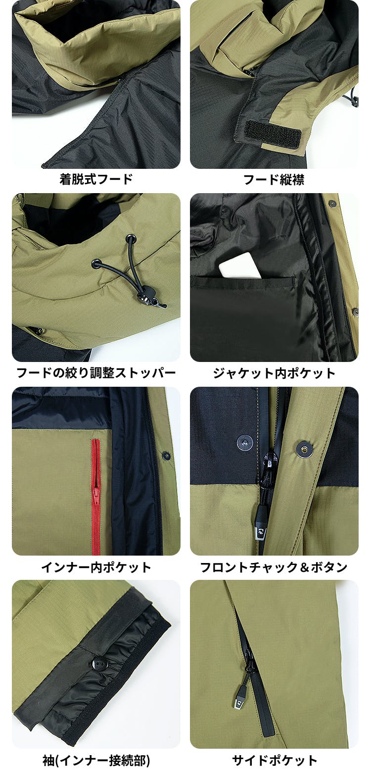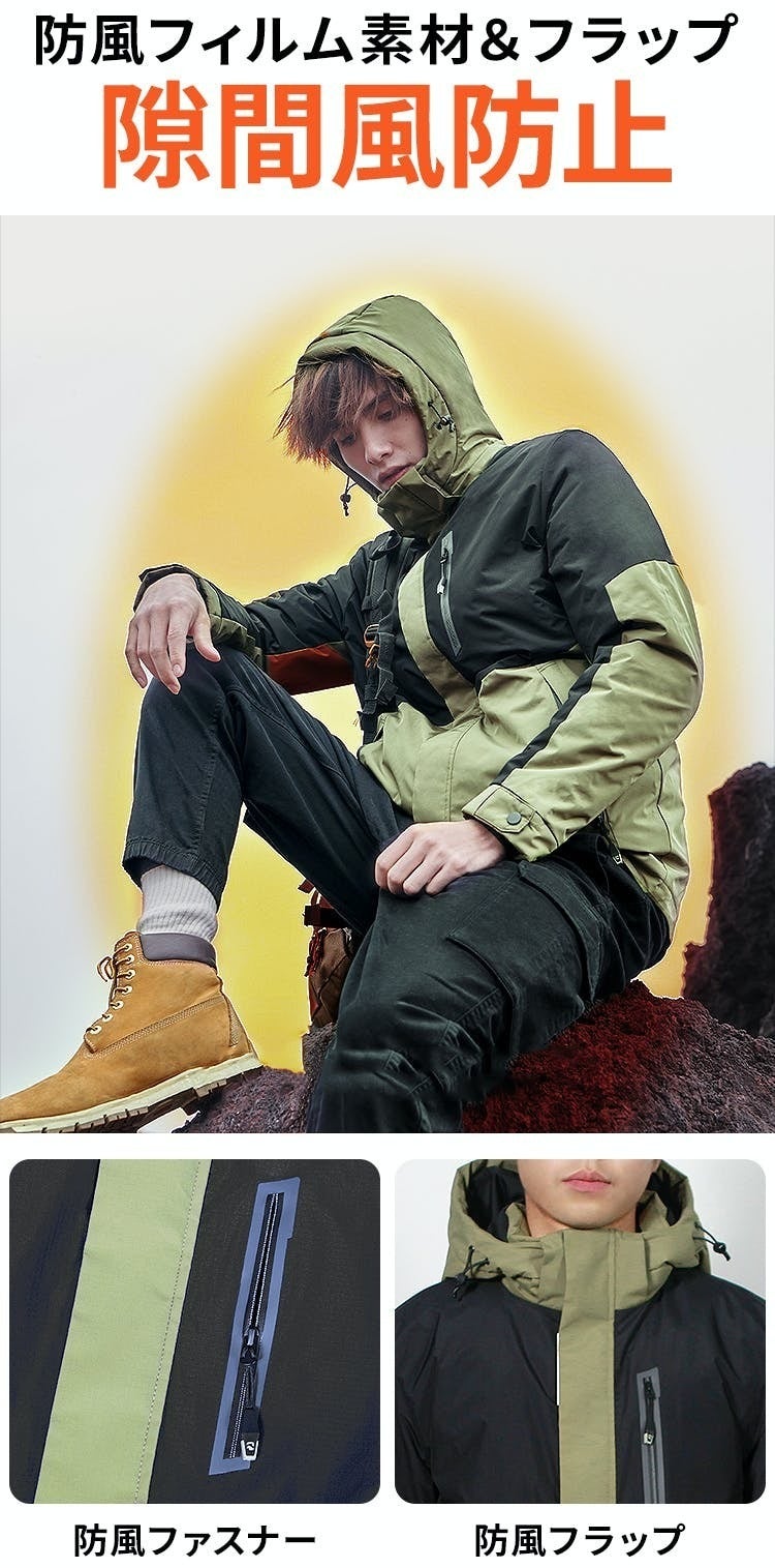 生地に防風フィルムを用いることで、保温性をアップ。見落としがちな、ファスナー部分からの隙間風の侵入を防ぐため、ポケットには防風ファスナーを採用しています。