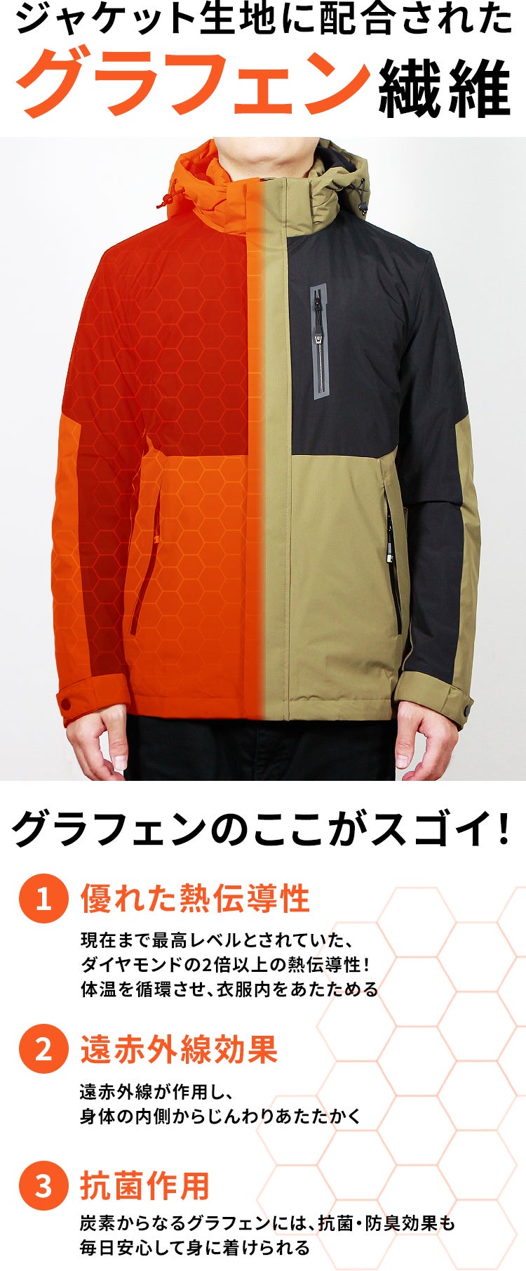 というお声におこたえし、生地に新素材のグラフェン繊維を配合した、高い熱伝導性と保温性をもったジャケットを開発。