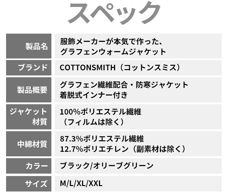 今回お届けする「グラフェンウォームジャケット」は、そんな、Mianjie (Beijing) Network Technology Co., Ltd の主力ブランド、COTTONSMITH(コットンスミス)製。ジャケットだけでなく、ダウン、デニム、フリース、ニット、パンツなど、機能性・着心地を追求した様々な製品を開発しています。