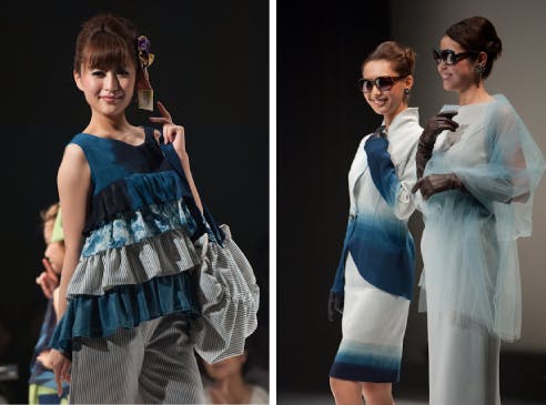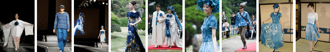 2009年からは「徳島コレクション」も阿波藍一色になりたくさんの人たちに魅力を発信しました。「国文祭」にも参加させていただき、初めての県外では京都の町家で、地元では西日本経済同友会大会・四弁連定期大会・徳島新聞女性クラブ等企業や新聞社のイベントにも参加しました。若い人たちに知ってもらおうと、モデルレッスンに通う子供たちが協力して藍染を広めるためボランティアでいろんなイベントに参加しました。