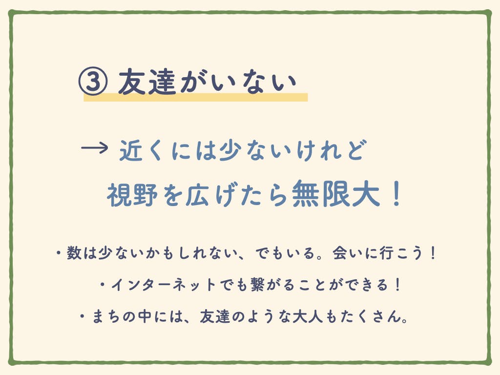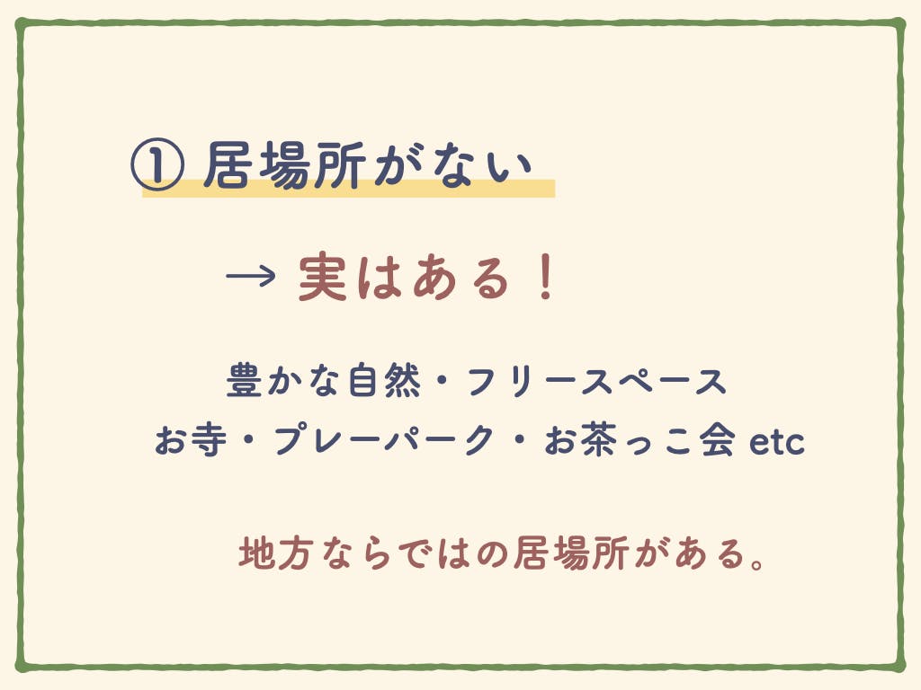 息子との日々や、おさんぽ会の活動を続けてきた出会いの中で、地方ならではの不登校の問題があることがわかりました。それはこの3つです。
