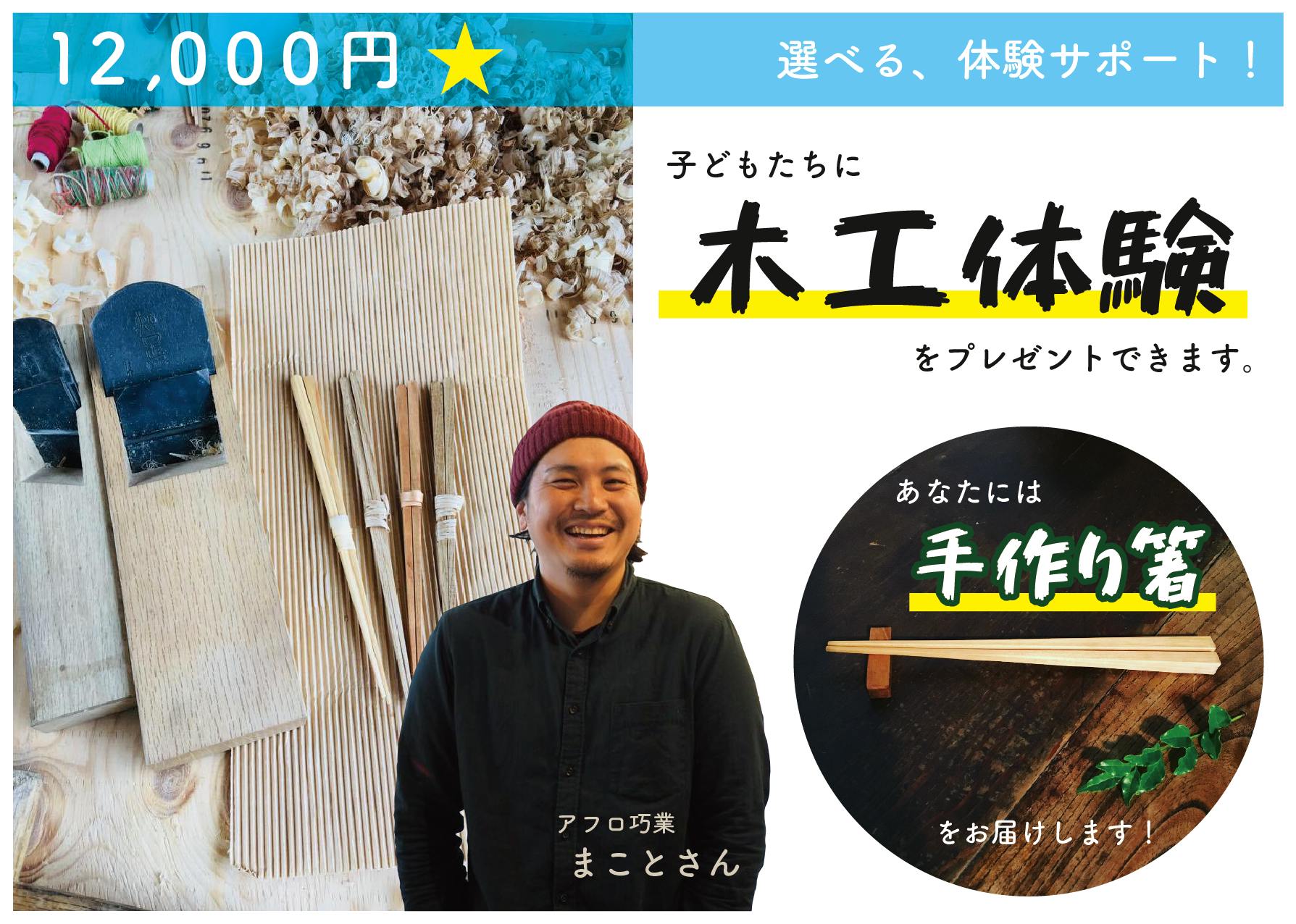 子供たちにはカンナで削って作る箸作り体験をプレゼント。大工さん以外ほとんど触る事がない『鉋』という道具を使って作ります。ナイフなどの刃物で削るよりも遥かに安全!