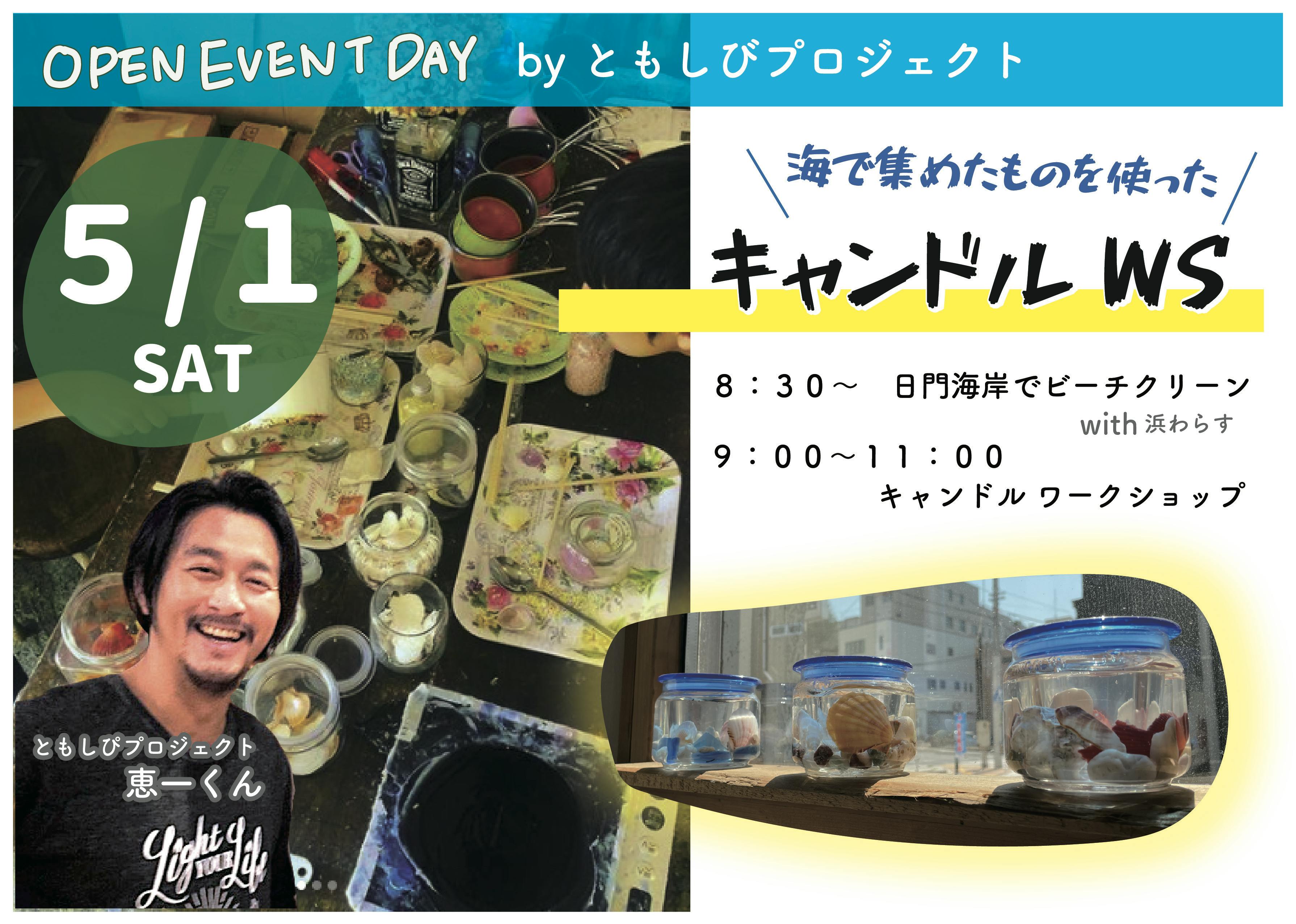 ともしびプロジェクトの協力のもと、海のものを閉じ込めたジェルキャンドルを製作します!キャンドルWSの前には、はまわらすのビーチクリーンにも参加◎