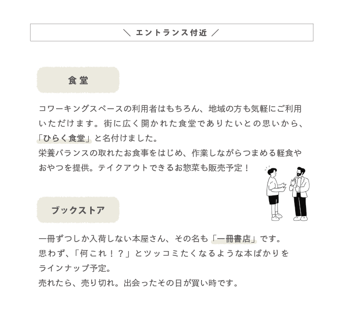 さらに食堂や本屋をきっかけとして、従前コワーキングスペースに馴染みのなかった人たちにこの場所に触れてもらい、多様な働き方を実践している人たちのことを知ってもらえる存在となっていきます。