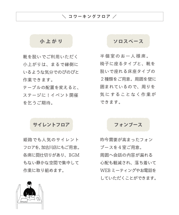 加古川店のみでご利用いただけるコワーキングスペース利用券と食堂利用券を2種類ずつご用意しました。