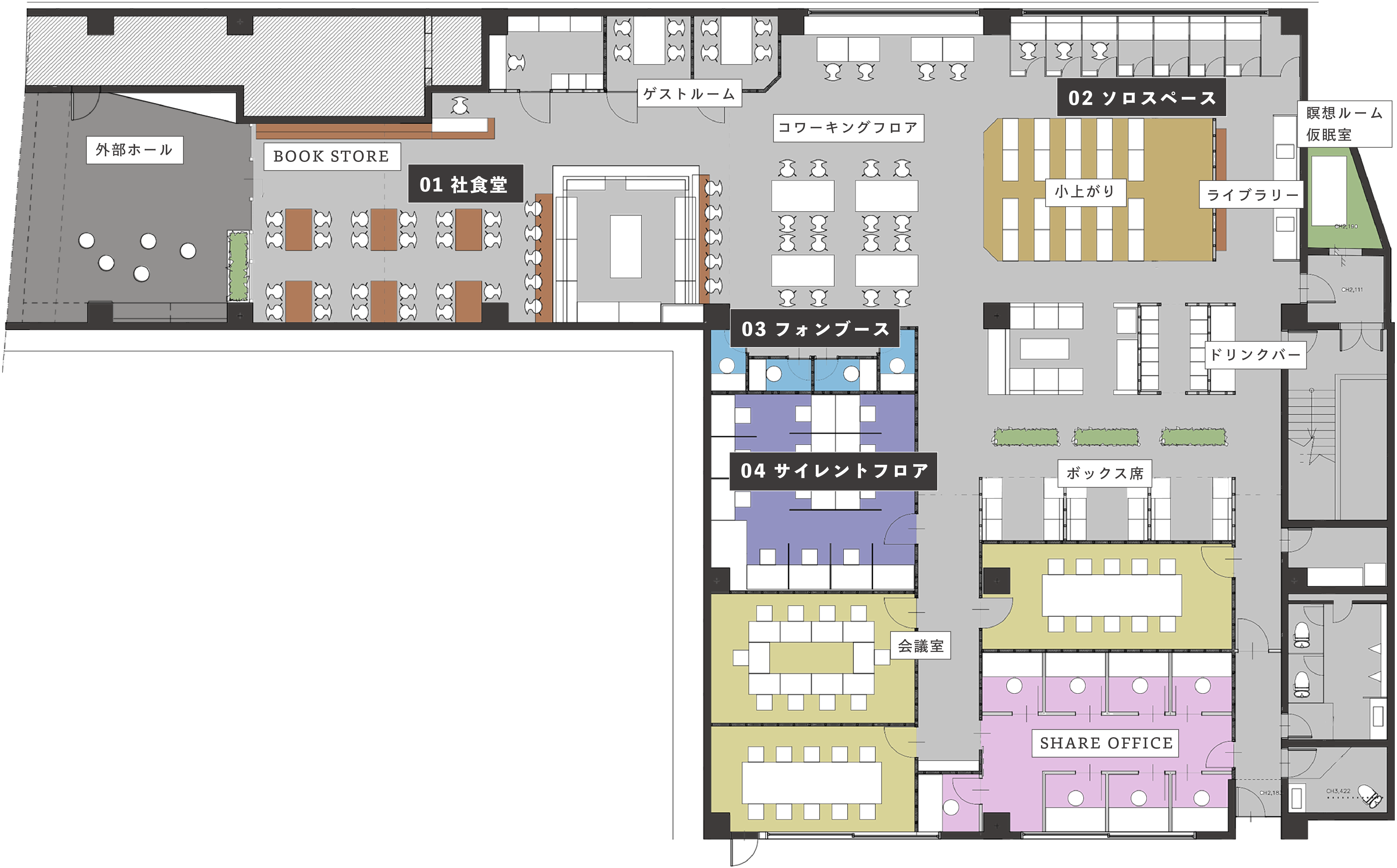 エントランス付近にはブックストアや食堂などを配置し、一般のお客様も立ち寄りやすい空間になっています。 奥に進むにつれてプライベート性が高くなる広い店内には、いろいろなタイプの座席をご用意します。