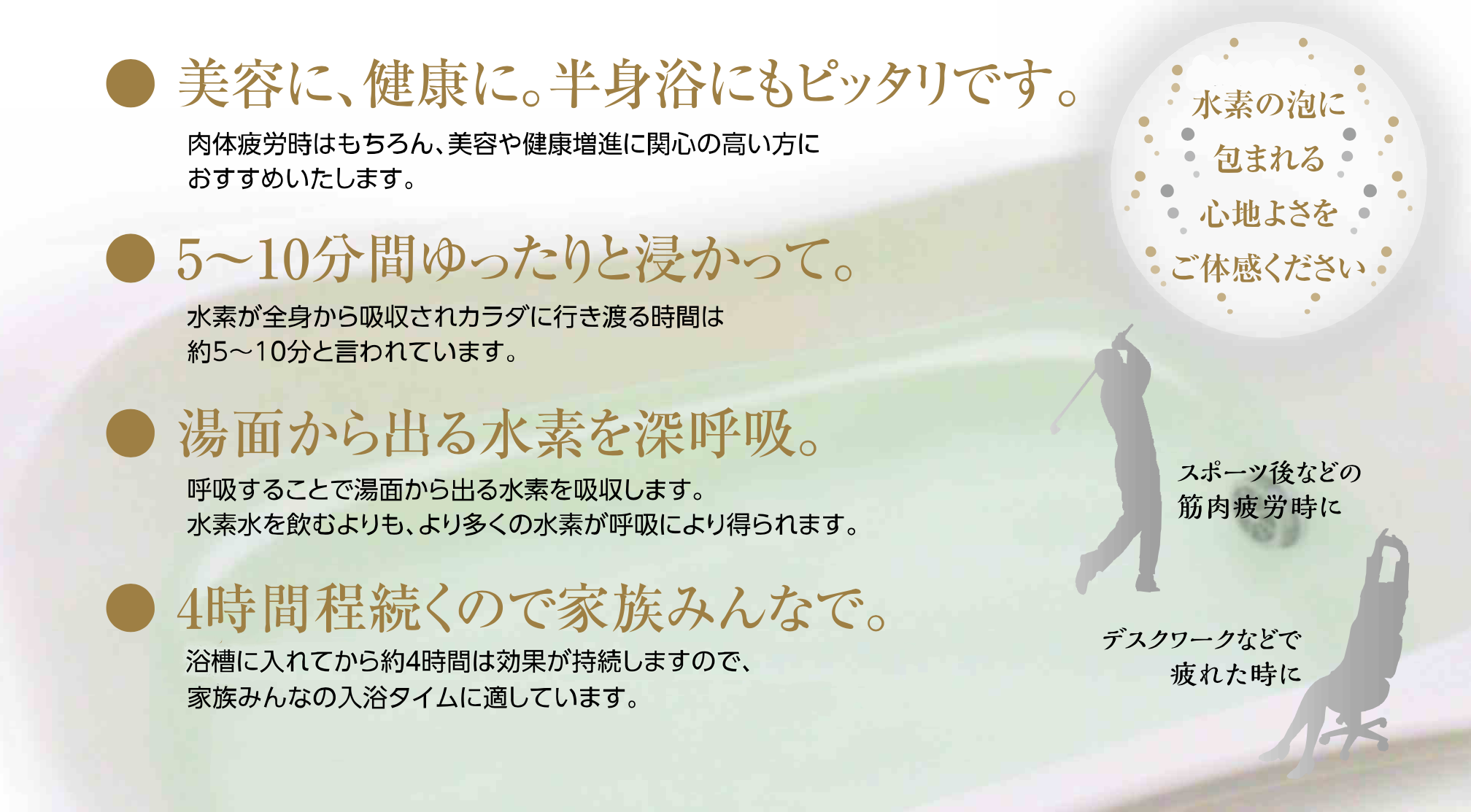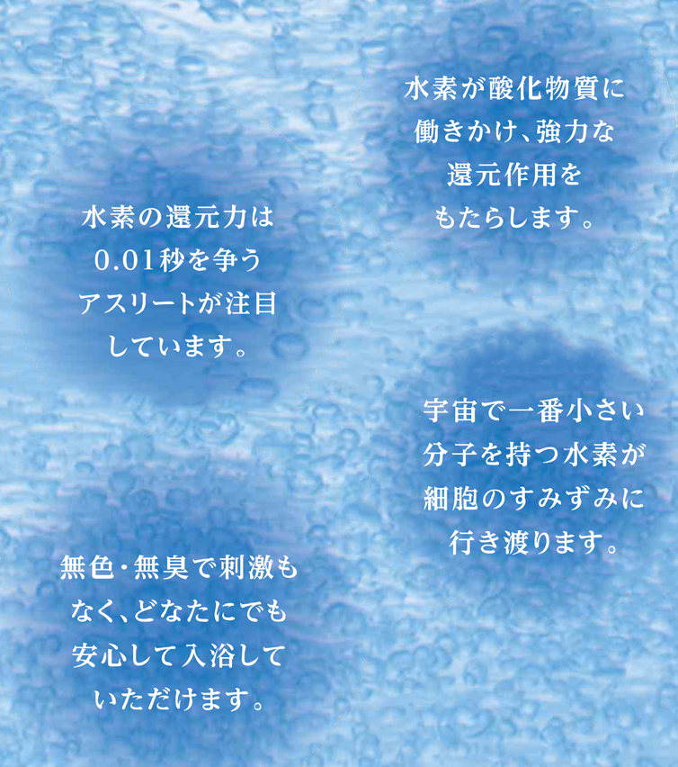 特にスポーツをする人は、この水素還元浴をすることで様々な効果が期待できます。