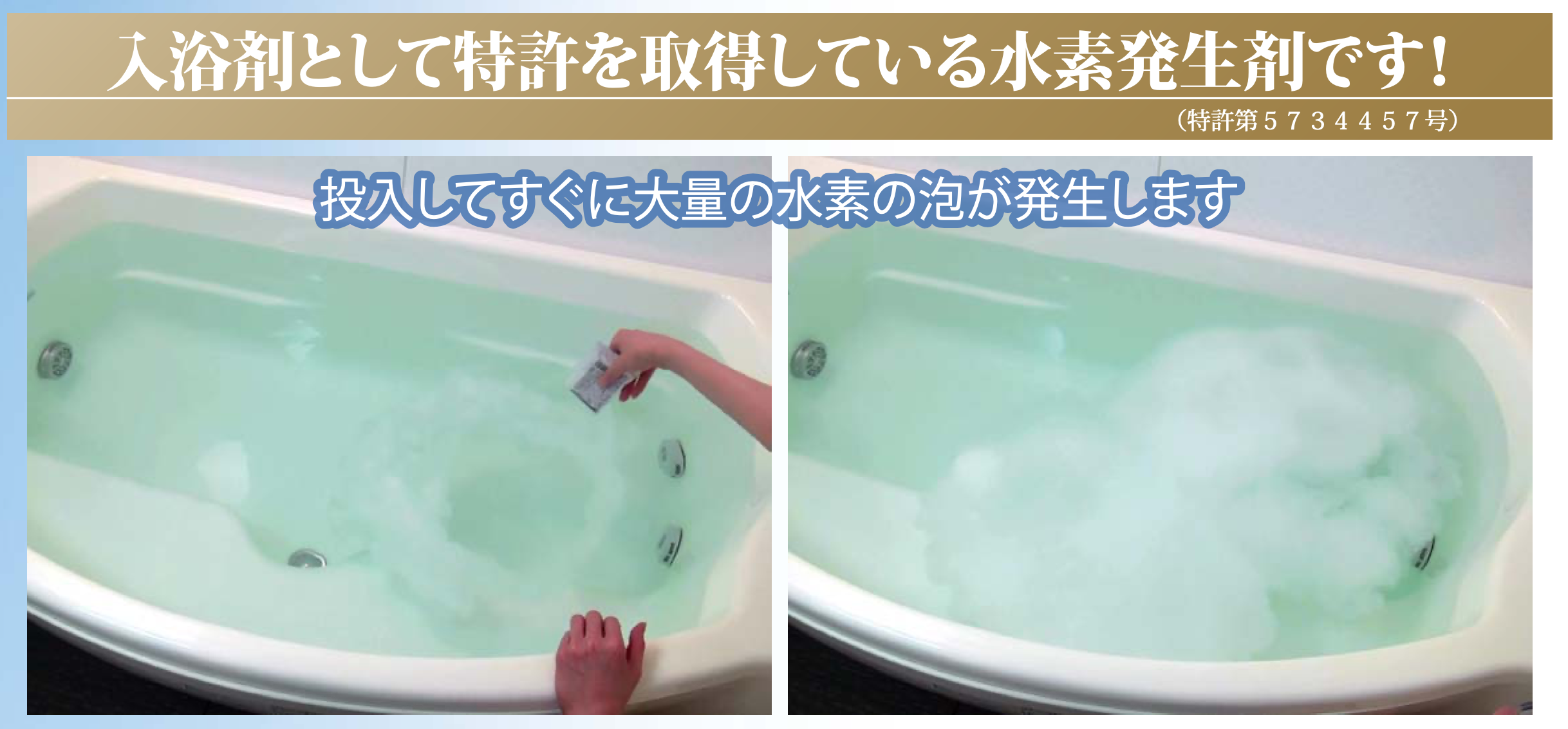 このH₂リカバリーバスサプリを約40°Cのお湯100~200ℓに対して1袋を加えるだけで、お風呂の中にたくさんの水素を作り出します。