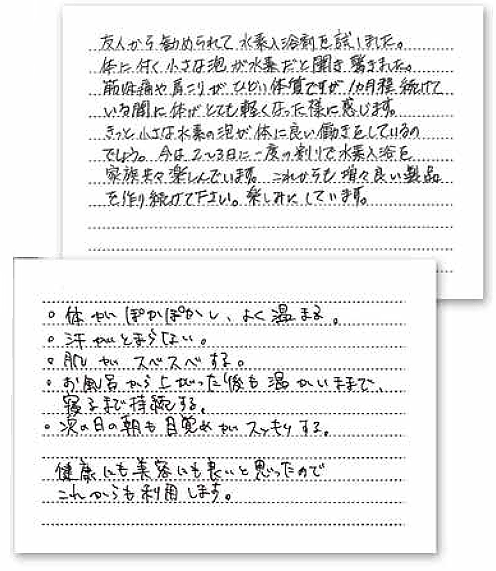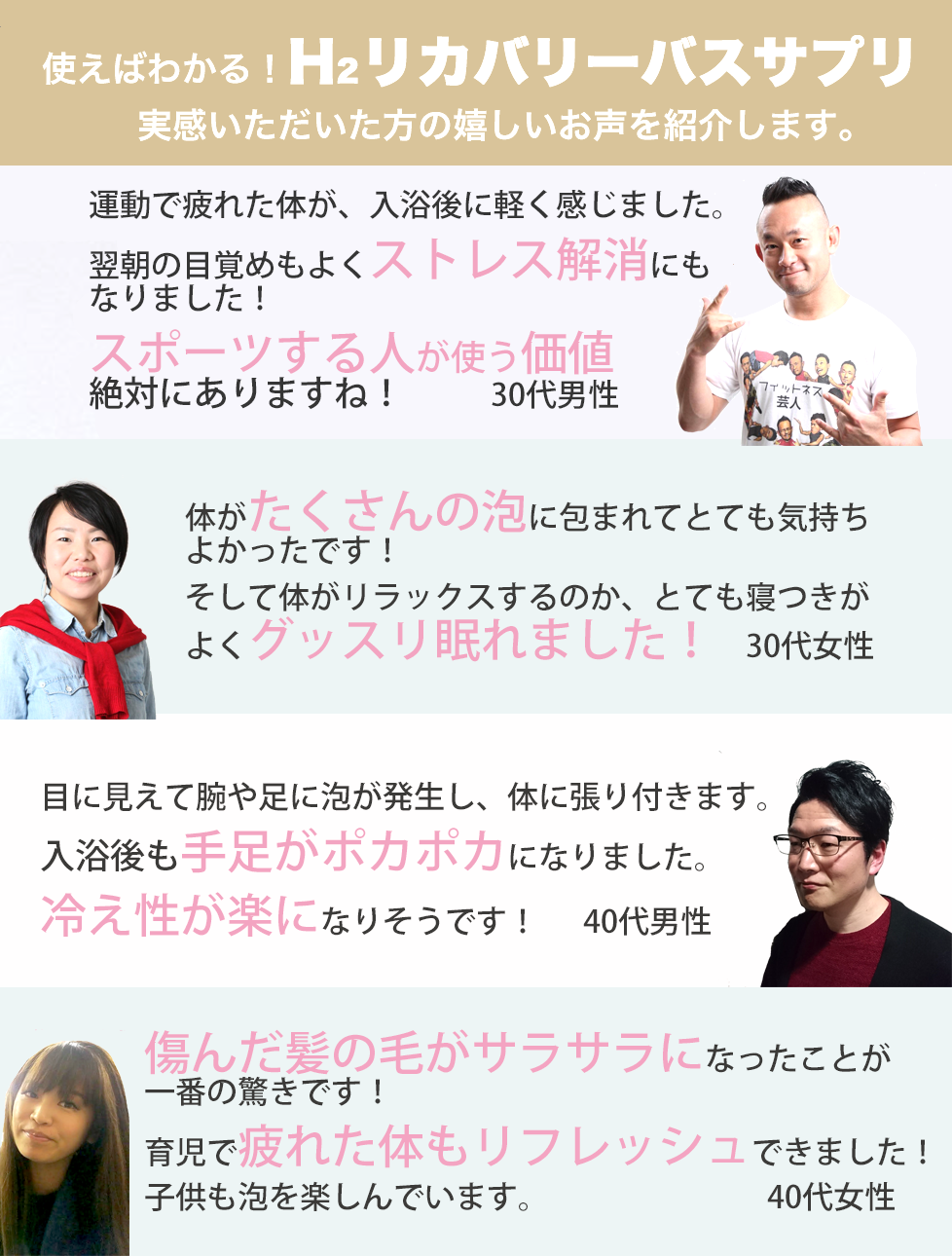 アスリートの男性からも「運動後の入浴に効果があります!もっと早くに知りたかった!」と感動の声をいただきました。