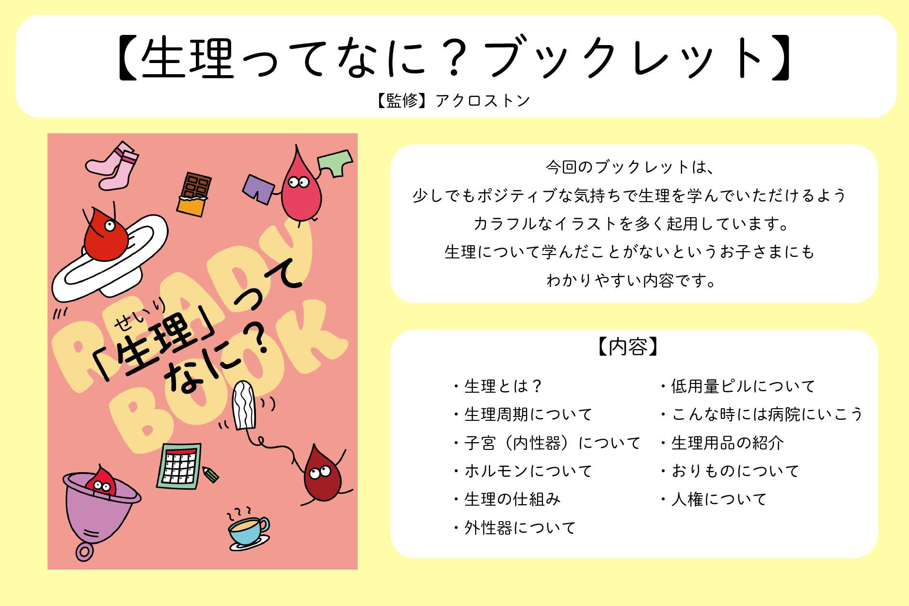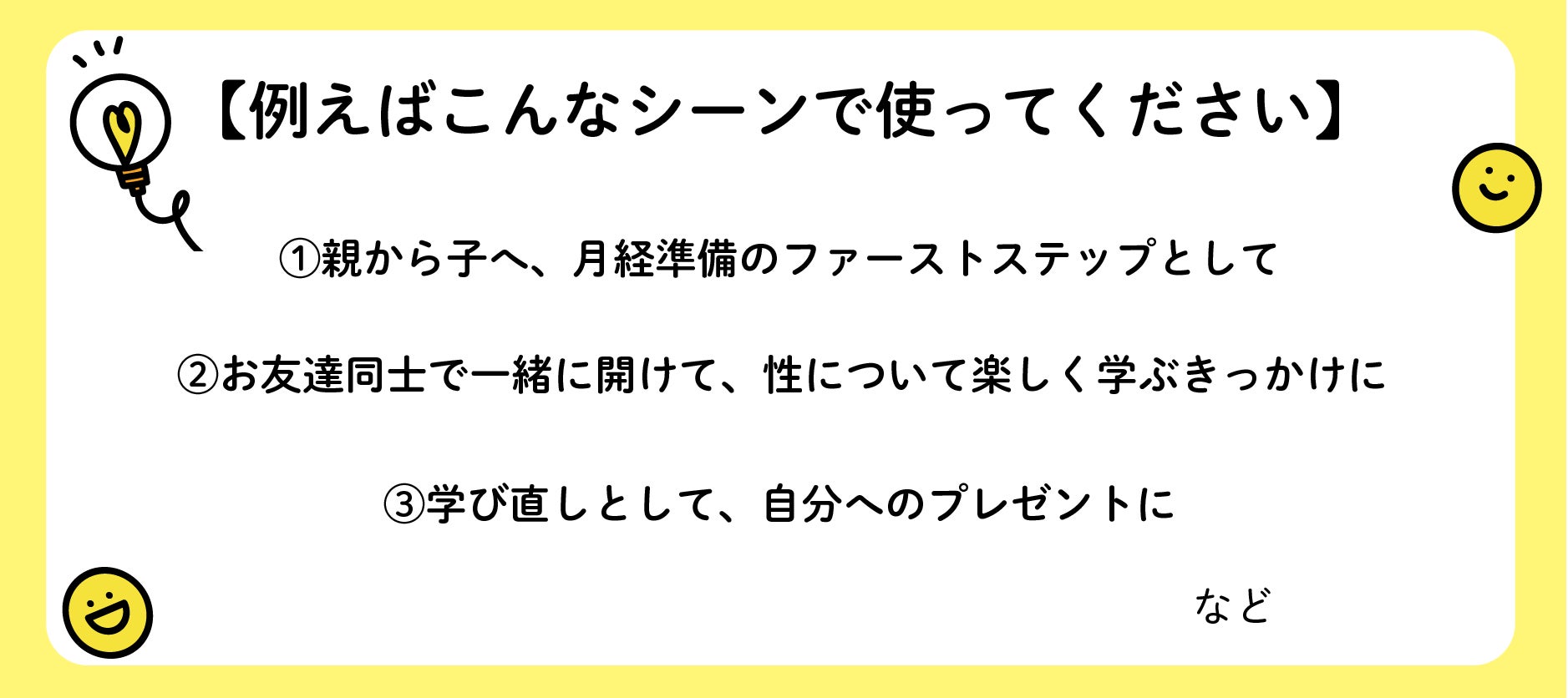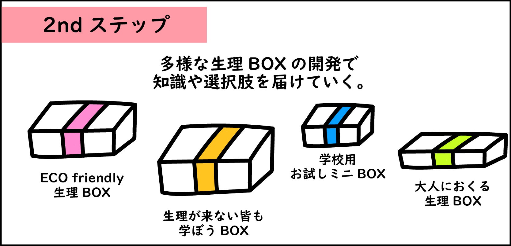 将来的には生理の枠をこえ、包括的性教育の普及につながる学習BOXや教材サービスの展開をしていきたいと考えています。例)性的同意、避妊、SOGI、プライベートゾーンなど