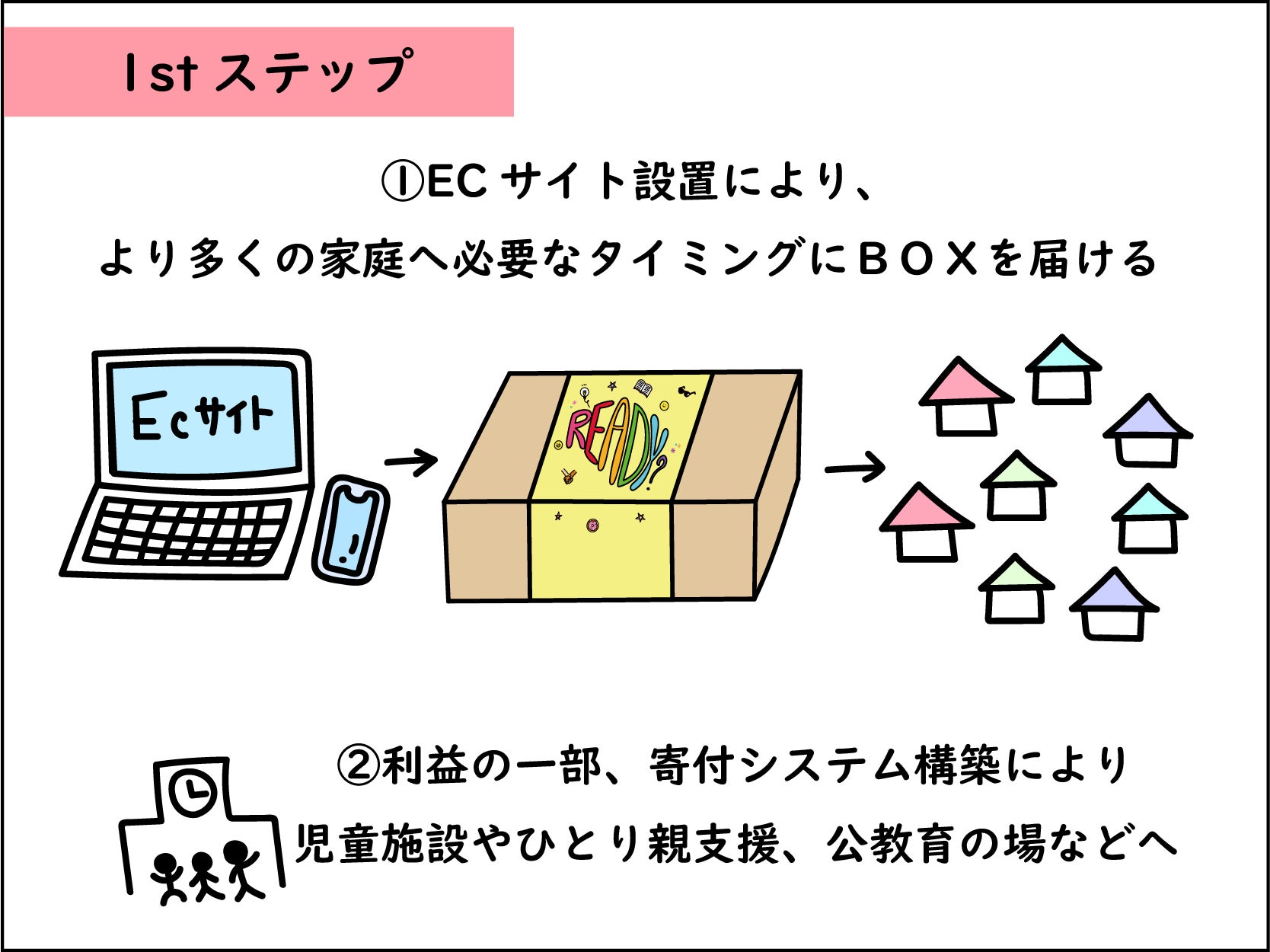 クラウドファンディング達成後、まずはできる限り多くのご家庭へREADY BOXを届けることを目指し、ECサイトを製作し一般販売を目指していきます。また同時に、児童施設やひとり親支援、公教育の場等と連携し、さらに多くの必要とする子ども達に届けられるシステムの構築も目指します。
