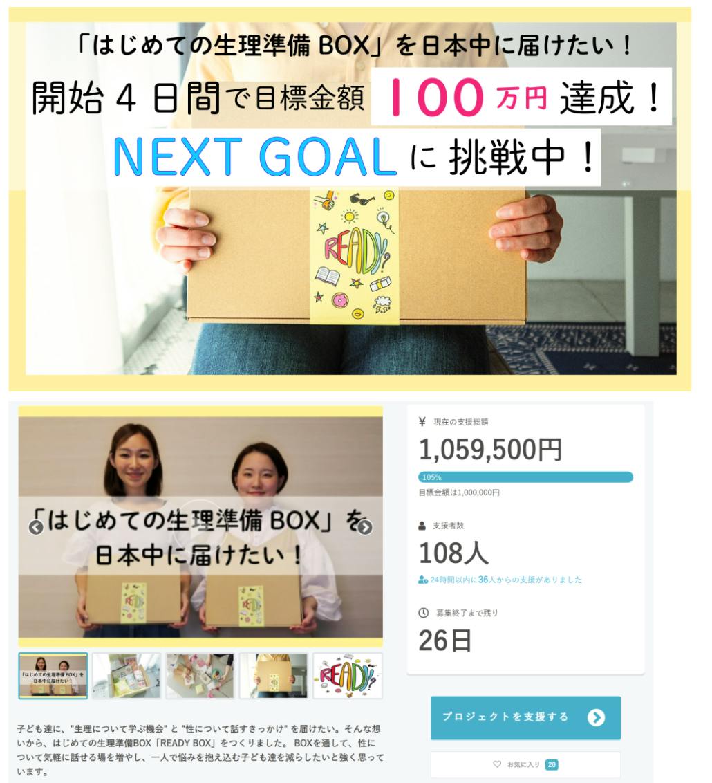 5月22日(土)にスタートした、はじめての生理準備BOX「READYBOX」のクラウドファンディングですが開始から4日目にして目標金額の100万円に到達いたしました!皆様からの温かいご支援、応援に心から感謝申し上げます。
