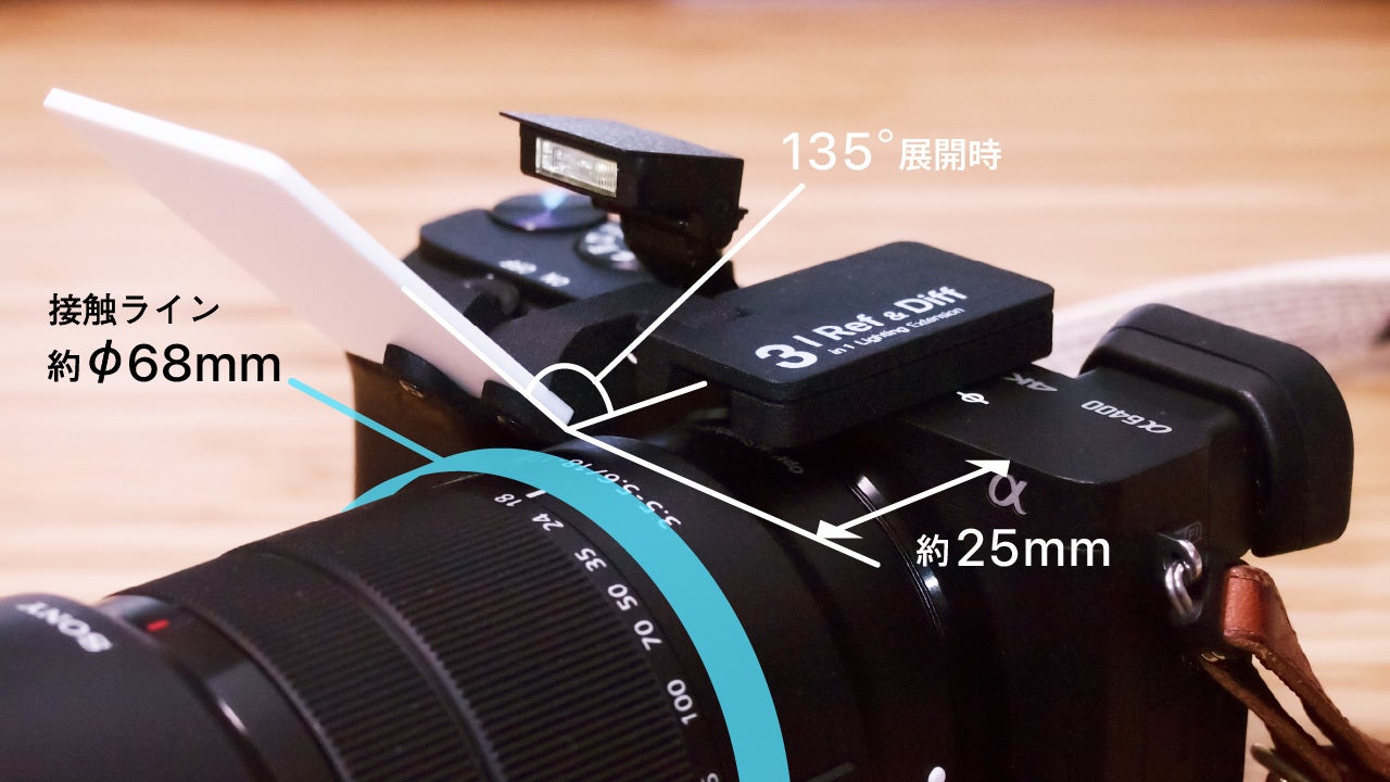 「レフとデフ」のホットシュー接続部からレフ板が135°展開した位置を基準として、