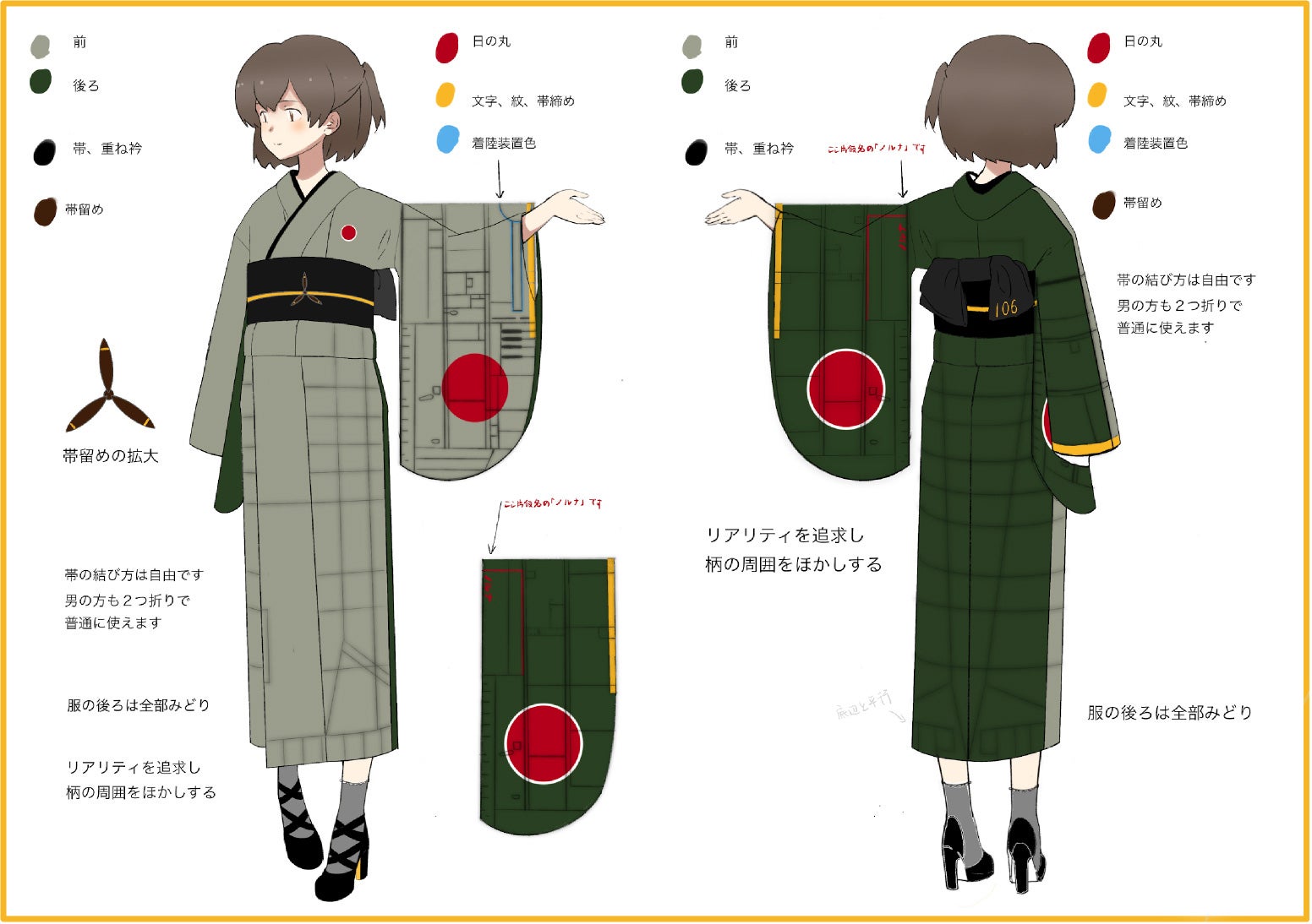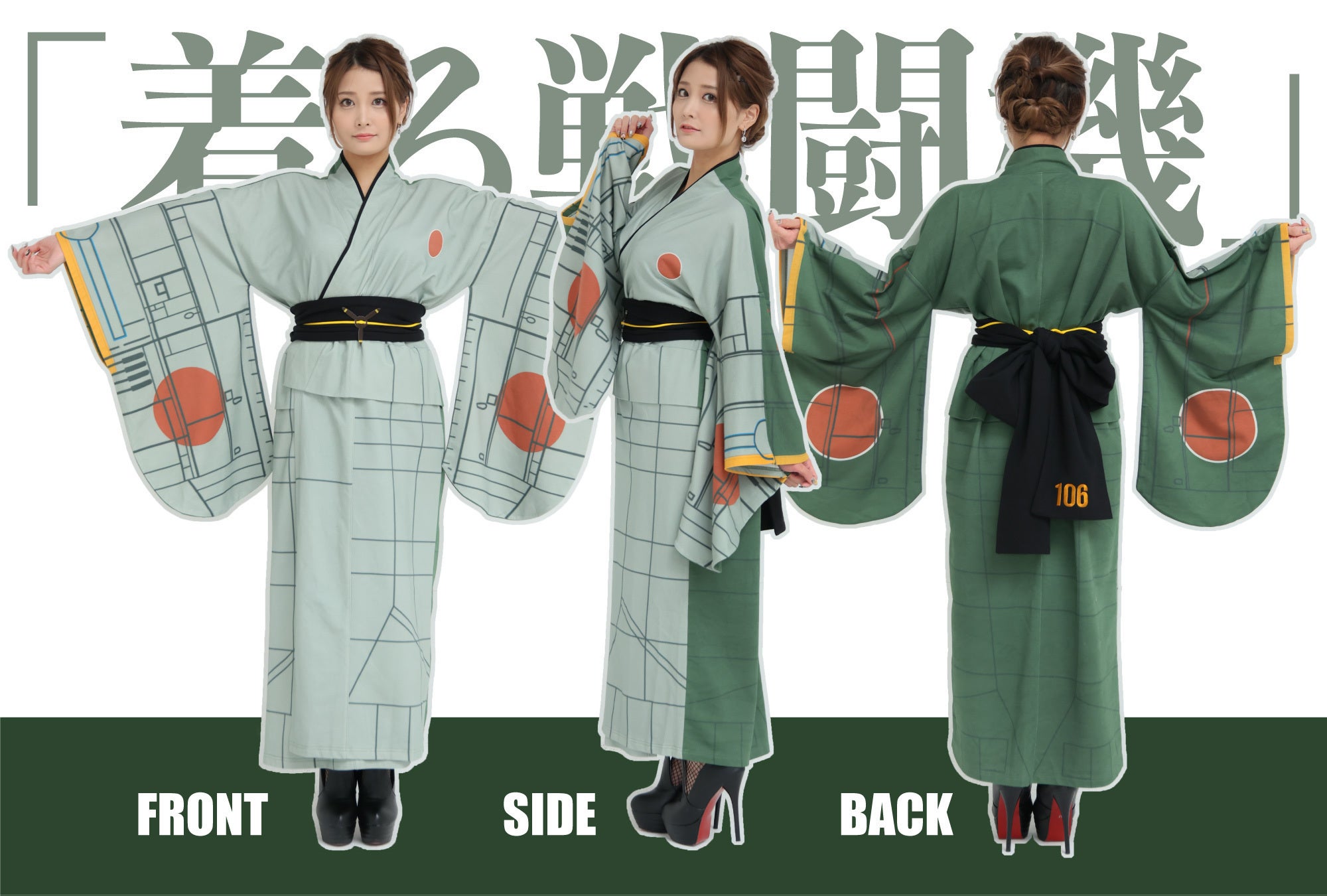 裏と表で色を変えるなど、細部までデザインにこだわり、どの角度から見ても零戦を意識した仕上がりです!振袖の部分を翼にみたてているので、両手を広げると零戦そのものですね…!