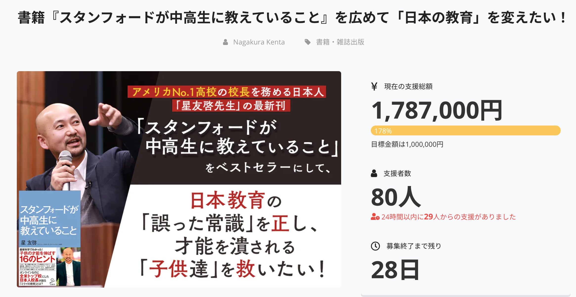 皆様こんにちは。現在挑戦している星校長の新刊『スタンフォードが中高生に教えていること』を広めるためのクラウドファンディングですが、予告していた通り・売り切れリターンを増枠させていただきました!公開後3日目となる今時点で・すでに80人の方からのご支援をいただき多くの賛同の声をいただいております。ありがとうございます!今回追加したものは以下になります。<追加されたリターン>・星校長の「未公開対談映像」 in スタンフォード大学キャンパス(あと2名)・哲学講義についての動画「厳選3本」(あと2名)・「才能の伸ばし方」セミナー映像(あと2名)・「バカになるための哲学の授業」セミナー映像(あと2名)・セミナー映像3点フルパッケージ(あと2名)・長倉顕太のオンライン教材「The power of editing」(あと2名)・長倉顕太のオンライン教材「Wording class hero」(あと2名)・星校長×長倉顕太の「個別オンラインコンサルティング」(あと2名)・星校長の講演会への招致権利(あと1名)どれも公開後、すぐに満席となった人気リターンばかりです。今回もすぐに定員となる可能性が高いです。見逃してしまっていた方はお早めにご確認ください。