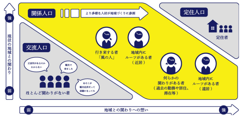 「関係人口」とは、移住した「定住人口」でもなく、観光に来た「交流人口」でもない、地域と多様に関わる人々を指す言葉です。