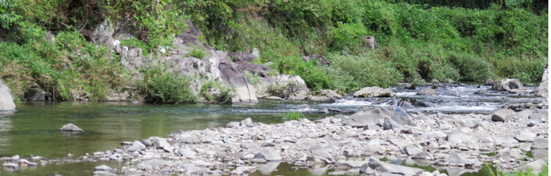 目の前には、神淵川という県の管理する河川が流れています。鮎は、孵化した幼魚は流され、海でプランクトンを食べて成長し、冬を越した稚アユは春から初夏に川を登ってきます。