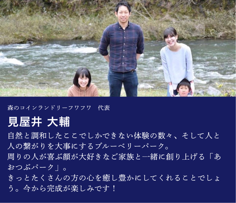 「あおつぶパーク」は、岐阜県七宗町で準備中の、ブルーベリーにまつわるテーマパークです。現在は、先祖代々受け継いできた山間の土地に、ゼロからのスタートでブルーベリーを植えているところです。養蜂や川遊び、宿泊や食事、カルチャー、そして自然を楽しみながら、みなさんと一緒に成長できる、ブルーベリー農園を作っています。
