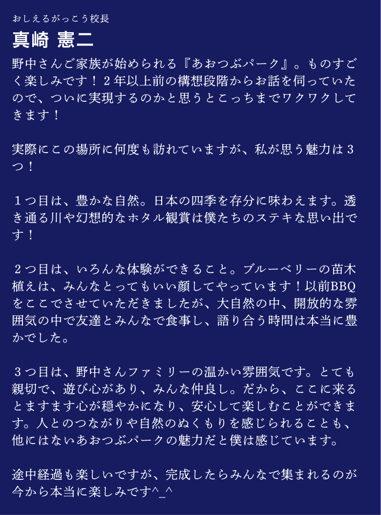わたしたちは、子どもたちが楽しく、自然と、人に触れ合える場所を作りたいと思っています。ご家族で一緒にゆったり楽しんで、休暇を過ごす。そしてまた、季節の折にここを訪れていただけるような。そんな「あおつぶパーク」を目指します。