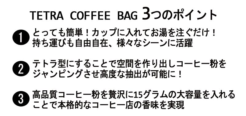 カップに「テトラコーヒーバッグ」を入れてお湯を注ぐだけ!ポータブルなコーヒーの新スタイル「テトラ・コーヒーバッグ」は、4面体にすることで空間を作り出しコーヒー粉をジャンピングさせ、高度な抽出を可能にしたものです。