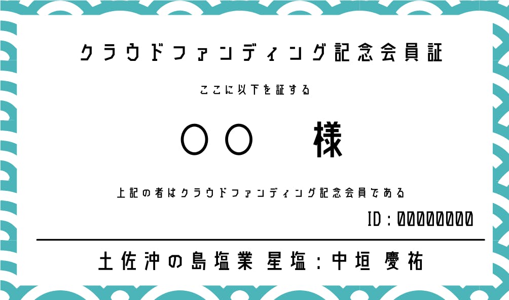 ※会員証のデザインは変更になる可能性があります。備考欄で会員証に記載するご氏名(企業名)をお教えください。記載されているご本人(企業)のみ有効です。購入時はご氏名(企業名)とともに会員証に記載されているID番号をお伝えください。土佐沖の島塩業の商品全品5%オフ購入権利は直接、土佐沖の島塩業とやり取りする場合に限ります(道の駅等で販売されている商品には適応されません)ただし、年間購入量10kgまでが適応され、それ以降は通常価格になります。年間購入量10kgの限度枠は年始にリセットされます。これは土佐沖の島塩業が廃業にならない限り続く権利です。