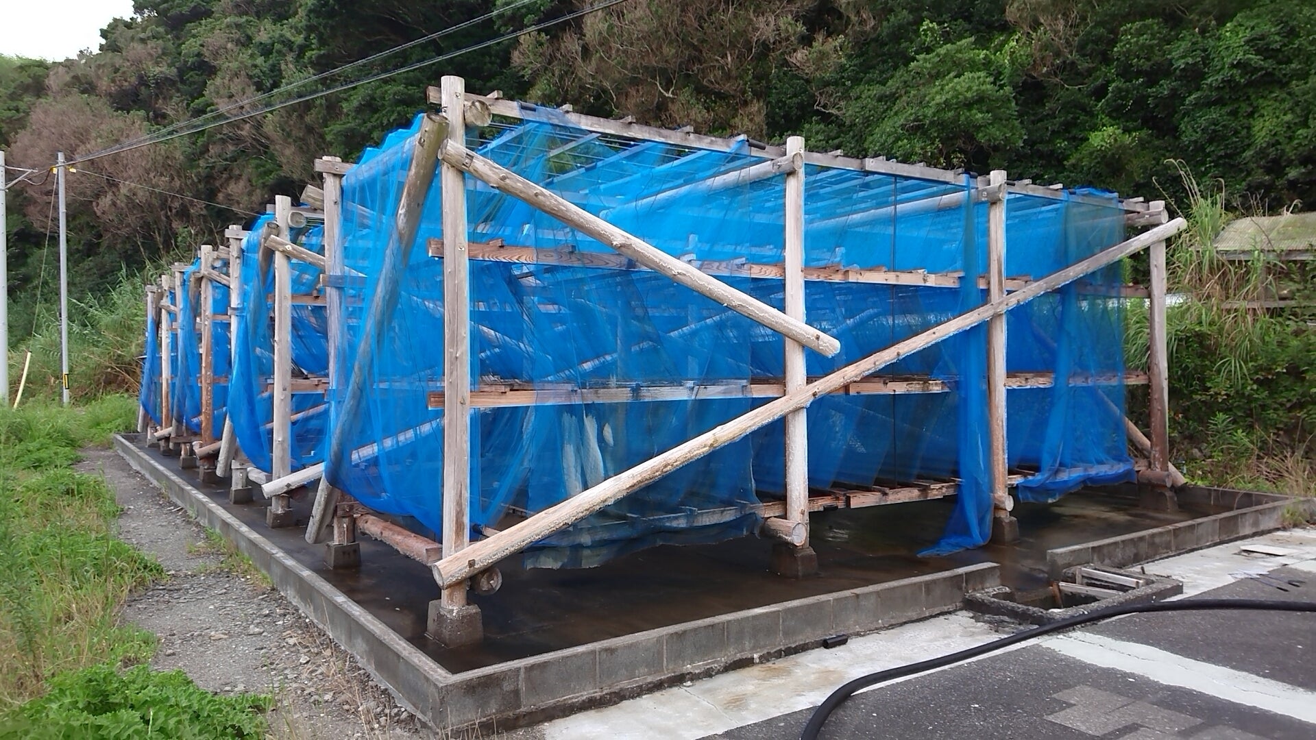 海水を汲み上げて流下式塩田と呼ばれるこの施設にシャワー状に循環させて蒸発を促します(㈲ソルティーブ様)