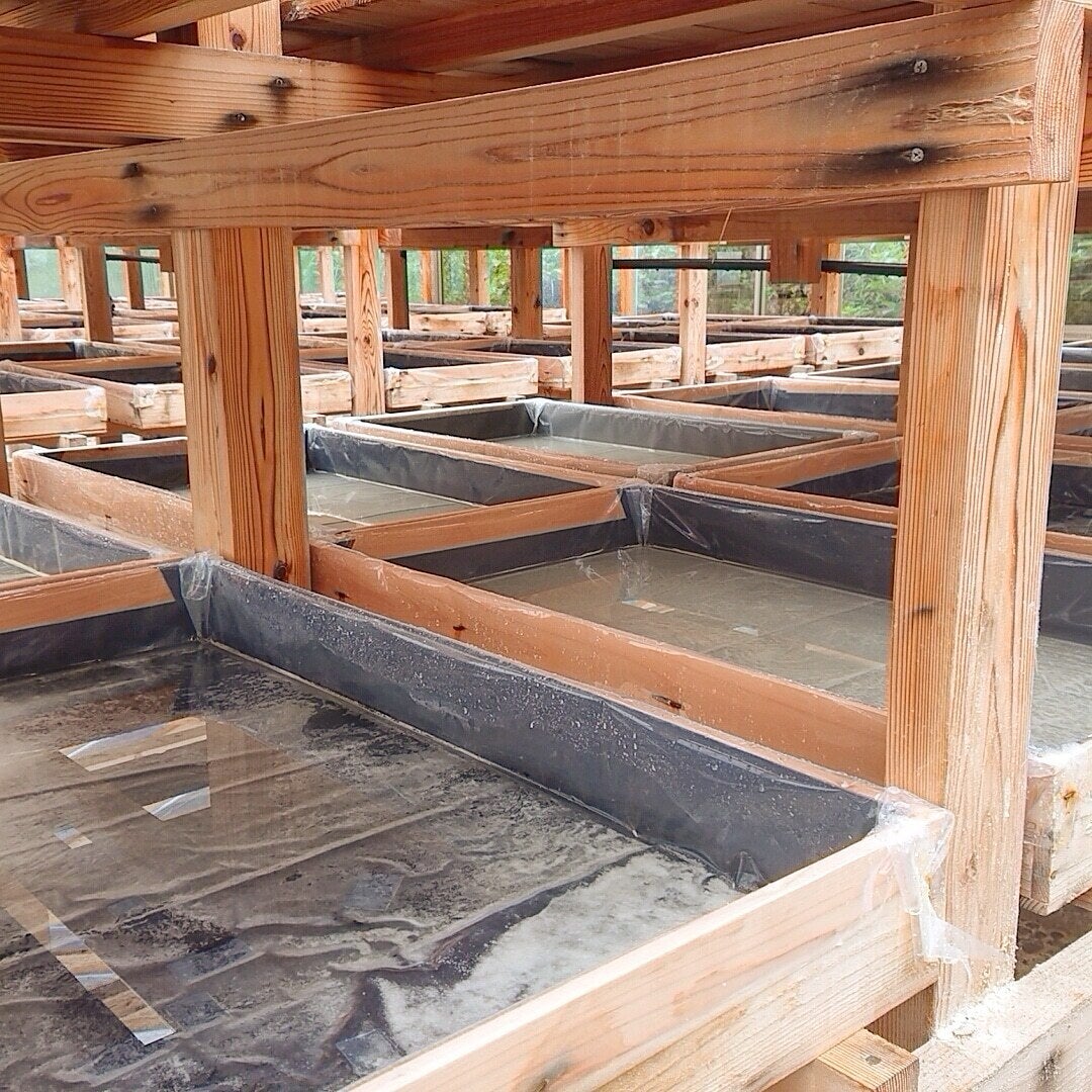 蒸発されて塩分濃度が高まったらビニールハウス内の木箱に移して仕上げの天日干しを行います(㈲ソルティーブ様)土佐沖の島塩業星塩の製塩施設建築予定地で測量をする設計士さん