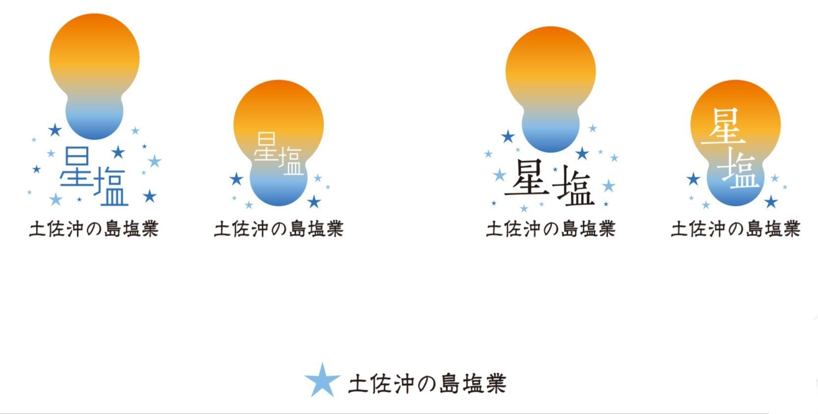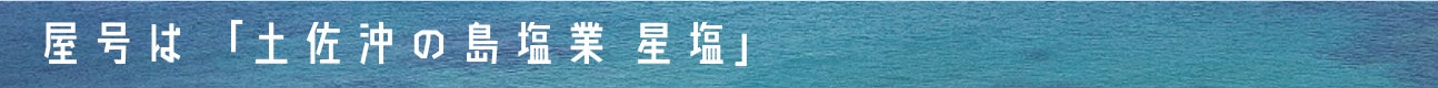 沖の島で最高の塩作りを、そして沖の島振興へ。それを自分自身の信念に、経営理念にして。製塩業の屋号は「土佐沖の島塩業 星塩」です。名前の由来は①塩の結晶が星のように輝いて美しい。②沖の島から見る夜空は満点の星が非常美しい。③流れ星に願いを込めるように私や島民の願い・想いが込められて塩ができている。この3つの由来から命名しました。又、この事業デザインは沖の島出身者が代表取締役をしている株式会社StarFACTORY様に作成を依頼しました。離れていても繋がれる。沖の島に縁もゆかりもない私でしたが、島を大切に想う気持ちは島民と同じです。