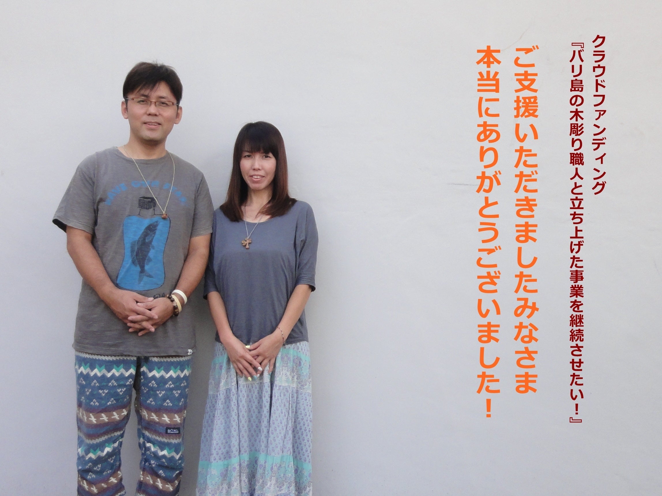 ★クラウドファンディング『バリ島の木彫り職人と立ち上げた事業を継続させたい!』35日間の初挑戦が終了しました。結果85名ものみなさまにご賛同いただき、目標の121%を達成する事ができました。ご支援いただきましたみなさま本当にありがとうございました!みなさまの温かいコメントが心に響きました。いただきました思いを必ずやウブドの職人・スタッフに伝えてまいります。リターン品がお手元に届くまでしばらくお時間を頂戴しますが、桜の花が咲くころにはお届けいたしますのでしばらくお待ちくださいませ。2020年、思いもよらぬ疫病が私たちを分断しようとしましたが、人類が開発したインターネットにより人と人の繋がりを維持できており、campfireさんのようなプラットフォームがあるおかげで、こうして思いを伝えることができ、今は行くことのできない異国の人々の生活も支援できます。その存在自体にも感謝し、事業継続のため2021年には再度新たなクラウドファンディングに挑戦とオンラインでの活動に力を入れていく所存です。今日は大みそか。大きな寒波がやってきているようですので、お体ご自愛のうえ、どうかお元気で新しい年をお迎えください。ありがとうございました!ubdy渡木誠渡木玲子