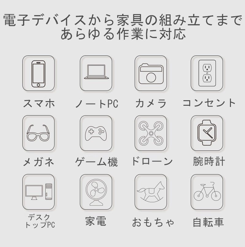 ご使用例:職人仕事に、PCのメモリ増設や自作、組み立て式シェルフやデスク、DIY、家電、各種デバイス、精密機器、メガネ、時計修理など。