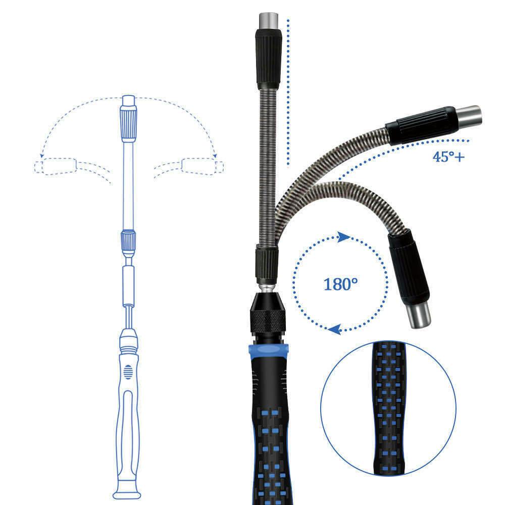 ▶ 曲がった穴の中や奥まった箇所の作業にも対応できるバネタイプの延長バー付き。まっすぐにドライバーをあてにくい場所のネジ締めも解決!