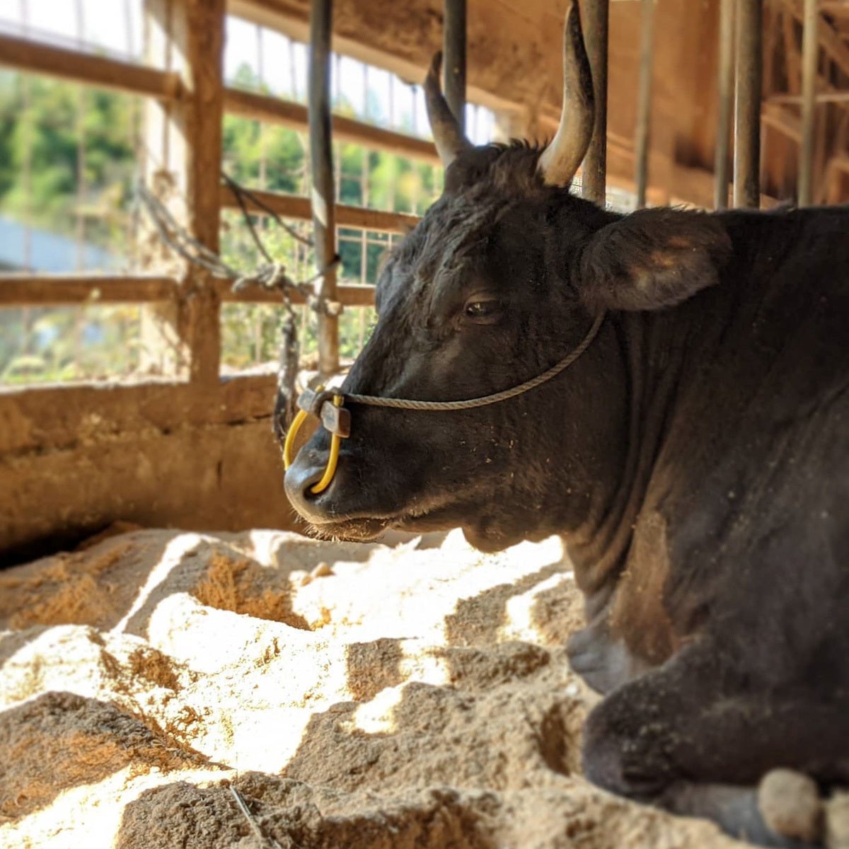 特に選ばれた牛は、日当たりの良い木造牛舎で、床にオガを撒いて柔らかく&暖かくし、丁寧に育てています。とても気持ちよさそうでしょ?