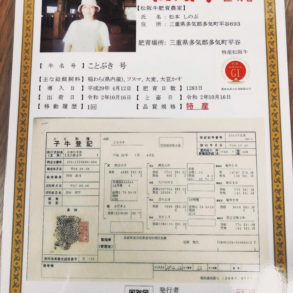 肥育から精肉販売・レストランまで運営している6次産業農家なので、すべてのお肉にこのような個体識別表とGIマークをつけることができます。今回はすべてのお肉に個体識別表のコピーをつけさせていただきます。最高品質の保証でもあります。